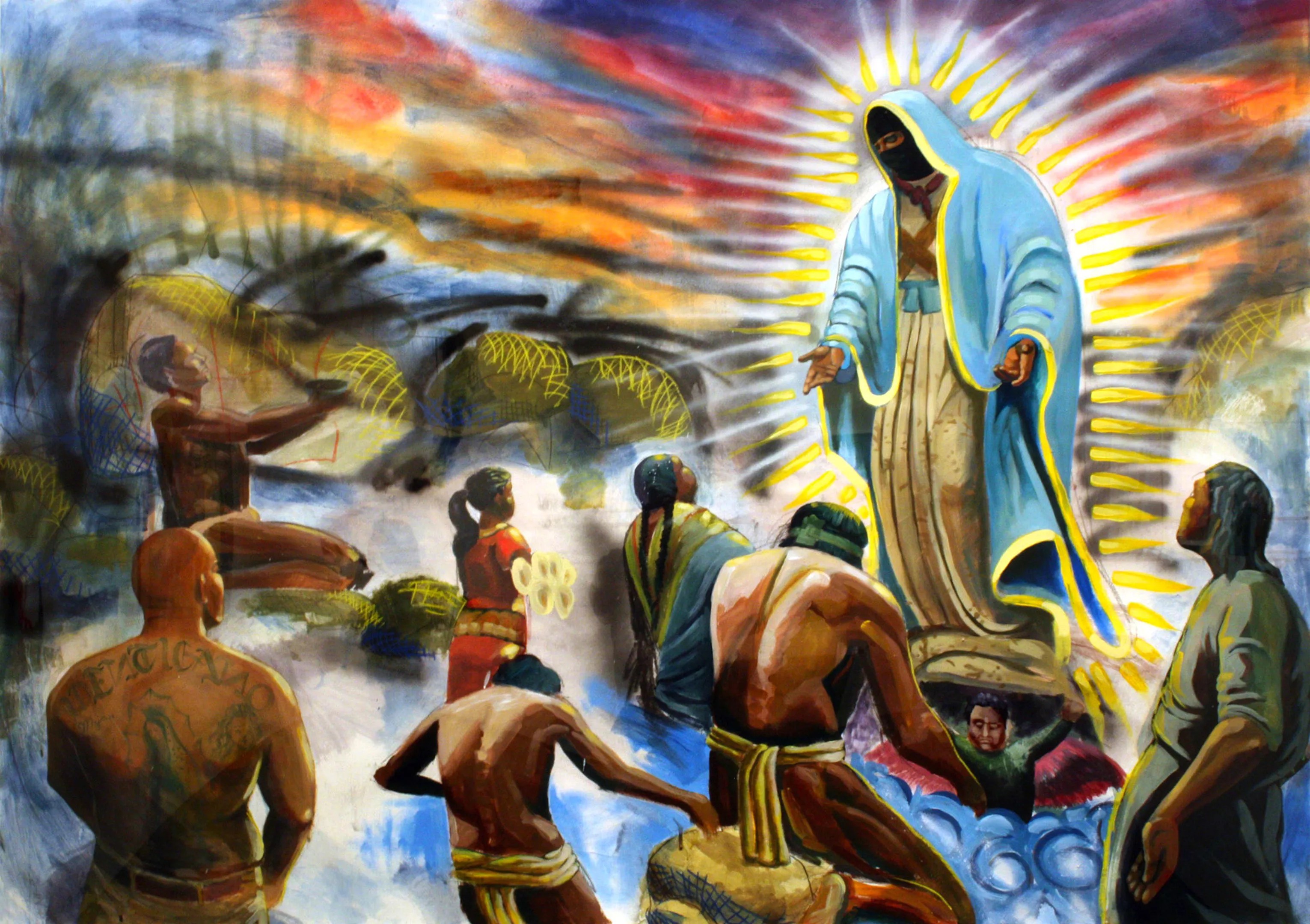 References to Roman Catholicism, Mexican style, is also not surprising, as shown off in “If La Virgen Returned,” by Pablo Andres Cristi, done in a street-art style with spray paint that creates vibrant and freely applied strokes of color. In the painting, Our Lady of Guadalupe, wearing a hoodie like a gangster, has appeared to a crowd made up of kneeling Mayans, Mexican campesinos and, in the left foreground, an apparent gang member, his muscular back covered with a tattoo of La Virgen that mirrors the apparition floating on the far right. It’s really sharp.