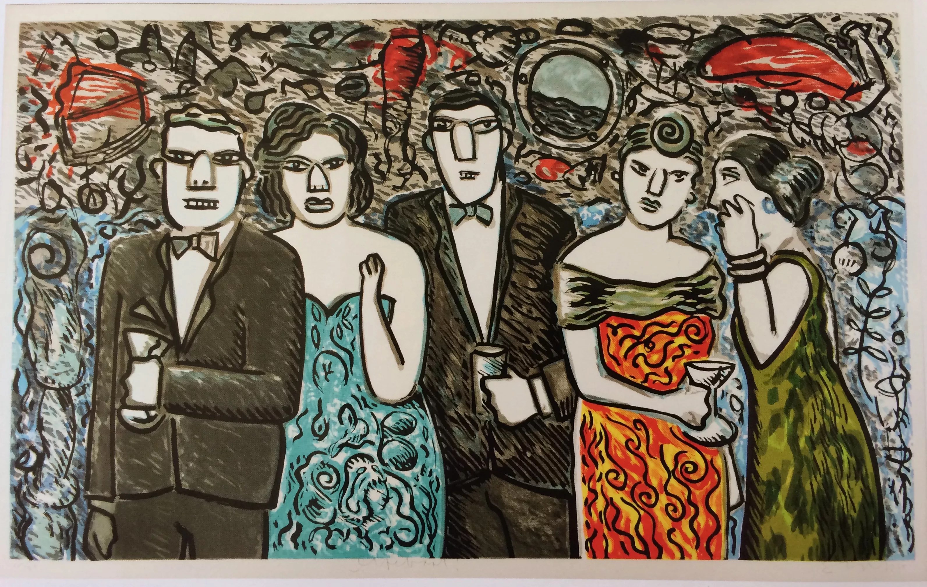 Even further outside the Chicano traditions is “Lifeboat,” a color lithograph by the renowned Gronk, the artist name of Glugio Nicandro. The artist has rendered a lineup of five well-dressed party-goers, two men and three women. Given the implicit edginess of the title and the fact that one of men, on the left, seems to be crushing a beer can, while on the other end, a woman is whispering into the ear of another, Gronk has infused the piece with an aura of tension.