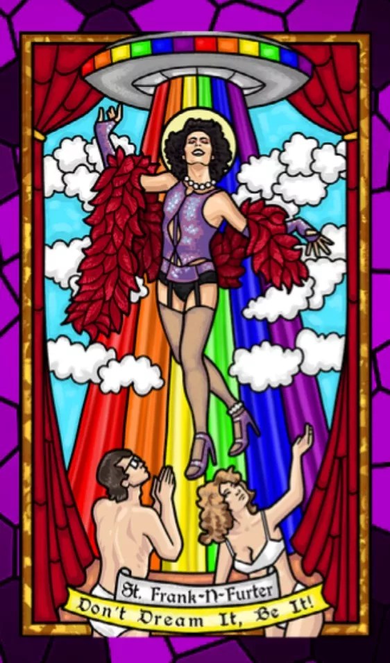 Art to promote the event drew from the pop-culture-based queer iconography inspired by religious stained-glass windows. Scahill drafted such community artists as Alejandro Trejo and Phil Ray to create votive candles (available only at shows; other merch, including T-shirts, is available on the website) to celebrate the intersection of religion, film and sexual and gender identity. One of these candles – a Rocky Horror spin-off depicting Dr. Frank-N-Furter ascending into a rainbow-lit flying saucer – was inspired by a memory from Scahill’s childhood elementary school. “I got sent to detention because I told the nuns that [a stained-glass window] looked like Christ was going up in a UFO. It was in that detention I met my first girlfriend – a girl who’d grow up to be a very butch lesbian,” he laughs.