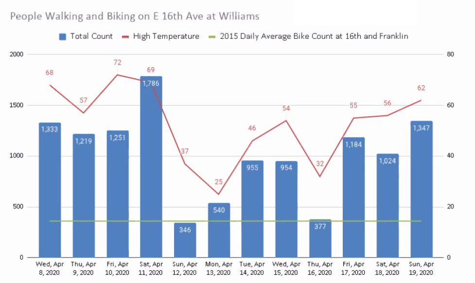 On Friday, April 24, DSP executive director Jill Locantore; board chair Danny Katz, who is also the director of CoPIRG; and board vice-chair Molly McKinley, a grassroots advocacy manager with Bicycle Colorado, presented data demonstrating Denver residents’ increased use of the newly open and shared streets. The data was based on a pedestrian and cyclist counter placed on the corner of 16th Avenue and Williams Street on April 8 that gathered data on how people were using 16th, one of the city’s recently designated shared streets.