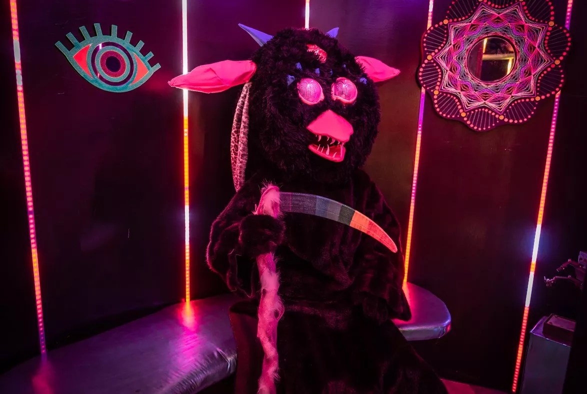 And there’s plenty to have fun with. Costumed characters roam the installation and provide a few good shock scares. A room directly across from the Spookadelia entrance is a funhouse decorated with warped mirrors rendered into fuzzy, adorable monsters. A cushy cave of swirling fabric has icy walls with hollowed-out stalagmites that carry kaleidoscopic lasers within, as well as an augmented-reality activation. Another room is filled with old dolls (most of whose eyes you cannot see, which Young says is part of the plot) harvested from Young’s late grandmother’s collection, as well as a fortune teller that gives you your unique fortune along with a spirit animal. More interaction is found in a dome with bumblebees on the ceiling, whose wings will flutter when visitors tap on a small steel drum.