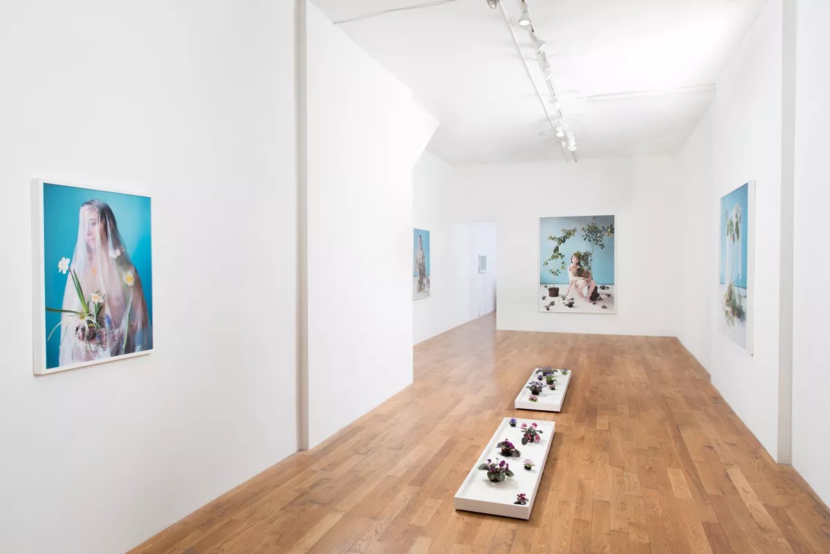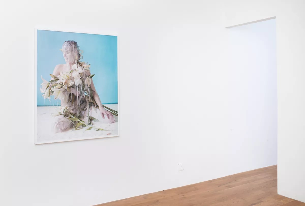 Sink’s references to religious paintings are even more pronounced in photos such as “Rianna, Narcissus, Veil, Milk” and “Meredith, Lilies, Milk.” In each, milk has been poured over the head of a young woman as well as over the flowers that she is holding; both pieces look like depictions of the Madonna. As we walked through the show with Sink, gallery director Adam Gildar noted that someone had said her work was reminiscent of that of Giotto, the Italian master. I didn’t see it at first, until I noticed all that luscious Giotto blue. Combined with the religious symbolism, it gives the show an Italianate aura.
