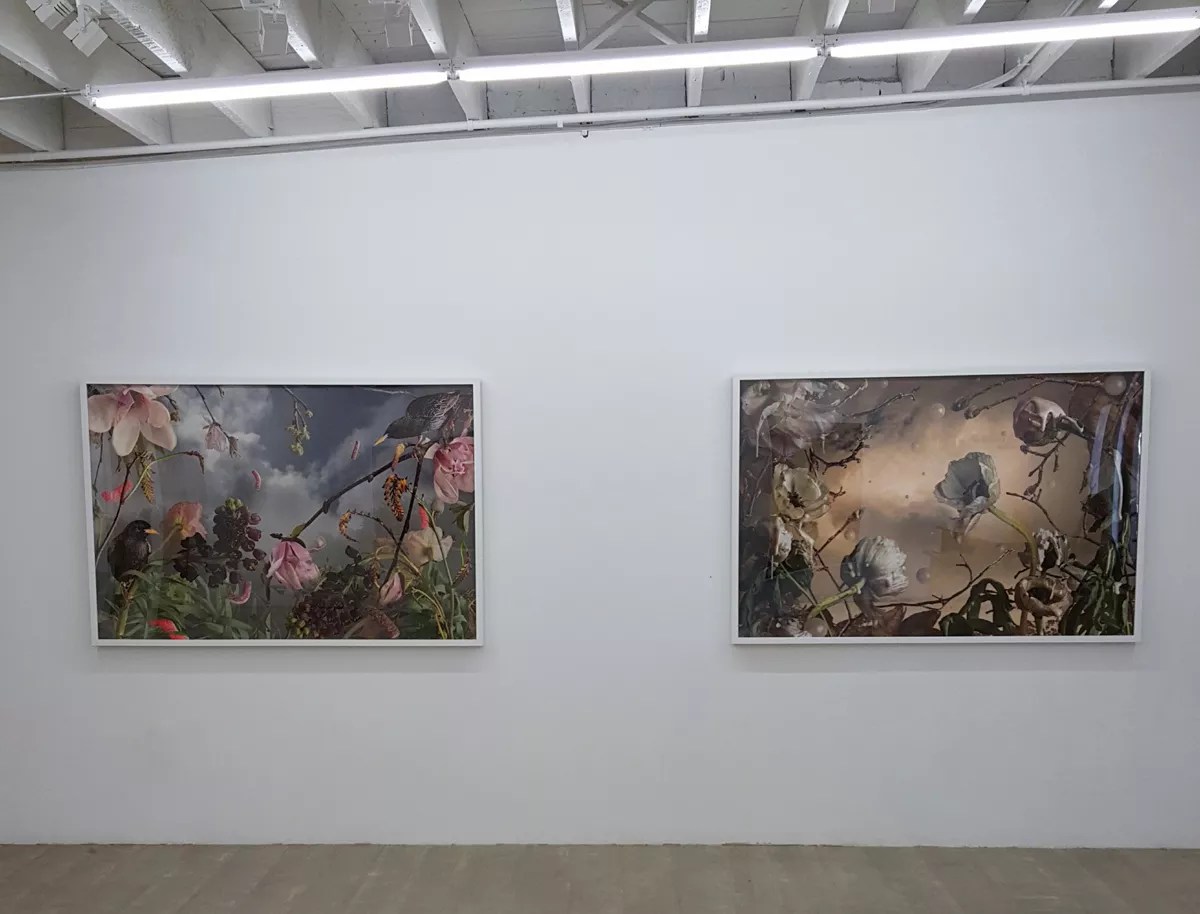 DeMarte does much the same thing but uses the now-tried-and-true Photoshop in its digital form, putting the elements together on the screen, then having prints made of the results. In “Fog of Tranquility,” DeMarte has inserted, tweaked and manipulated dozens of individual elements over a hundred times. The piece depicts a garden filled with blooming and budding flowers, with several birds perched on stems in and among them; the entire scene is set against a threatening sky. The shots of flowers are taken in various places, including gardens in the artist’s back yard; the images of the birds were produced using remote cameras tripped when a bird landed on DeMarte’s birdfeeder. Adding a surreal note, the flowers have been drizzled with some kind of translucent colored liquid that pools or organizes into droplets, depending on where they’ve wound up – though the nectar is just an illusion of the process standing in for physics. Pushing the artifice even further is “After the Deluge,” which also employs depictions of flowers along with a single bird. Here the flowers and bird are coated in what looks like pink latex paint, with the plants bending under the weight. “Invasive Apathy” (L) and “Unseasonable Icing” (R), by Jason DeMarte, archival pigment print. Courtesy of the artist