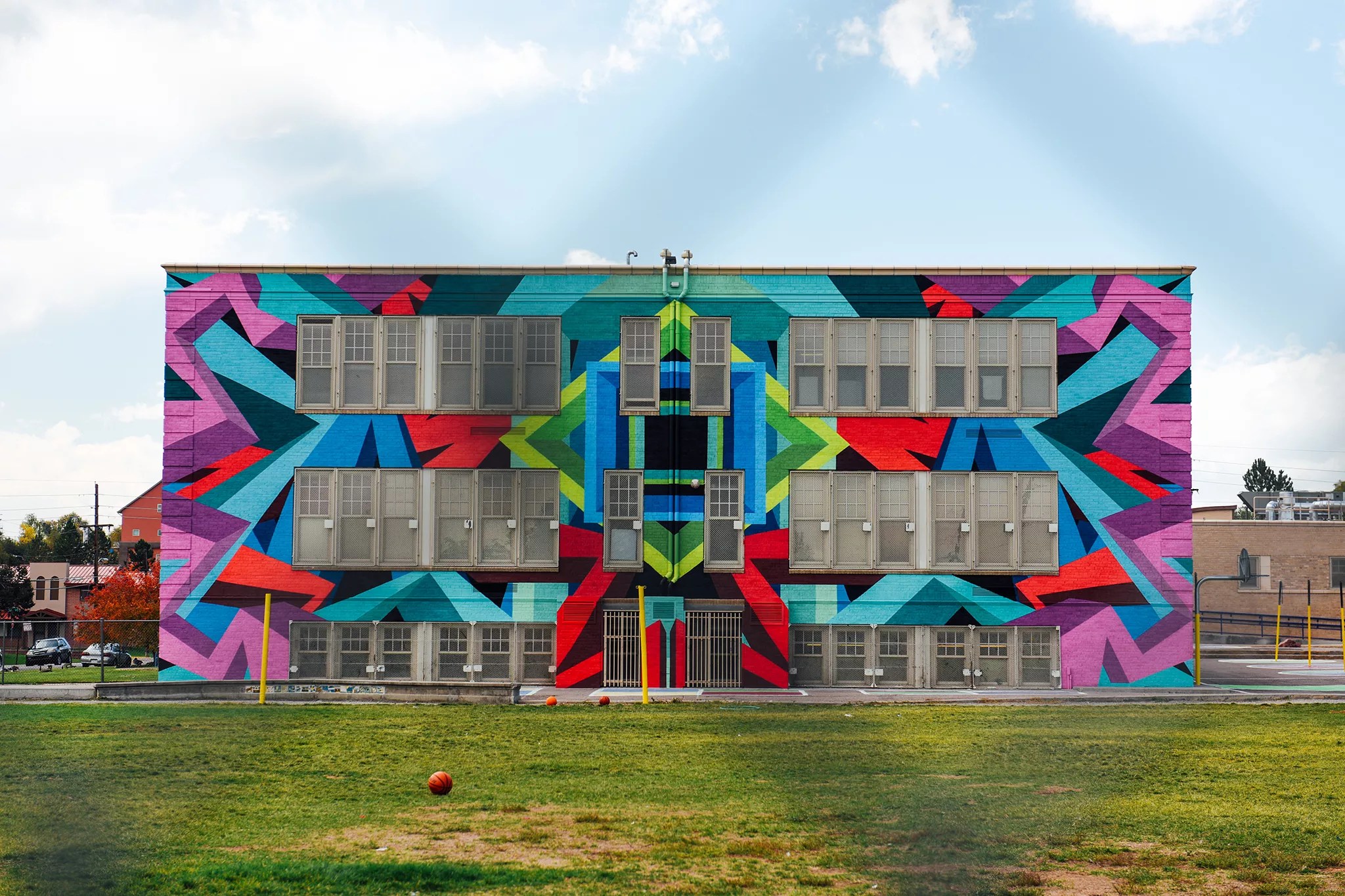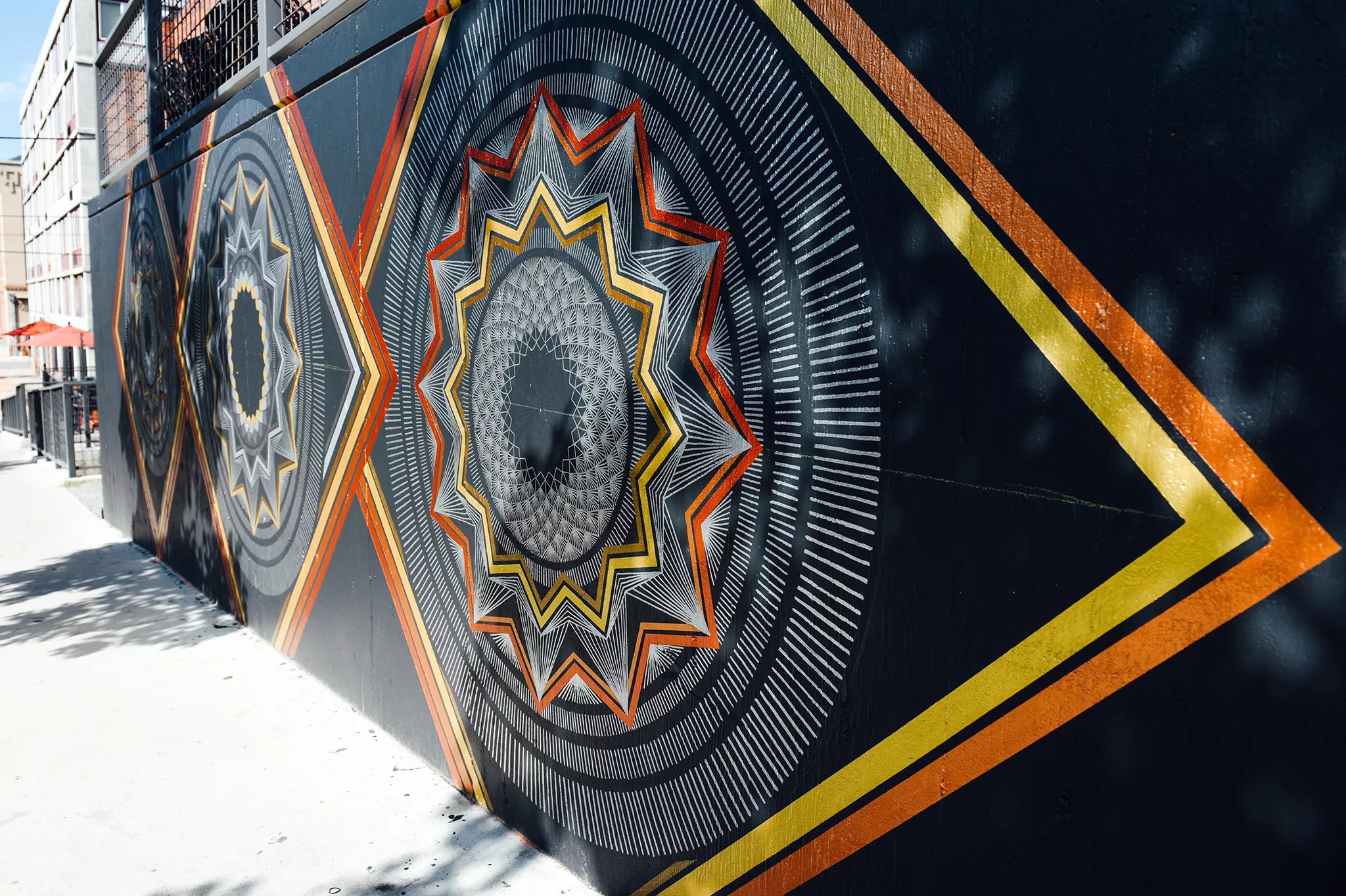 Known for her geometric shapes and mandala-like street art, Bayly added this piece to the RiNo Art District during CRUSH 2017.