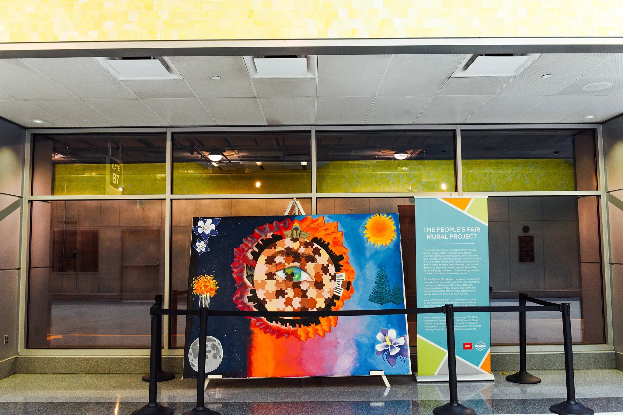This piece was completed this summer by students from Colorado’s Finest High School of Choice during the People’s Fair Mural Project, a live art contest. Colorado’s Finest High School of Choice provides an education for students who are looking to learn in a non-traditional educational environment; the students who contributed to this mural, now on display in the Union Station Bus Concourse, were Jesse Acosta, Karlee Cowlishaw, Allie Farnsworth, Emeilia Muilenburg and Grace Underwood.