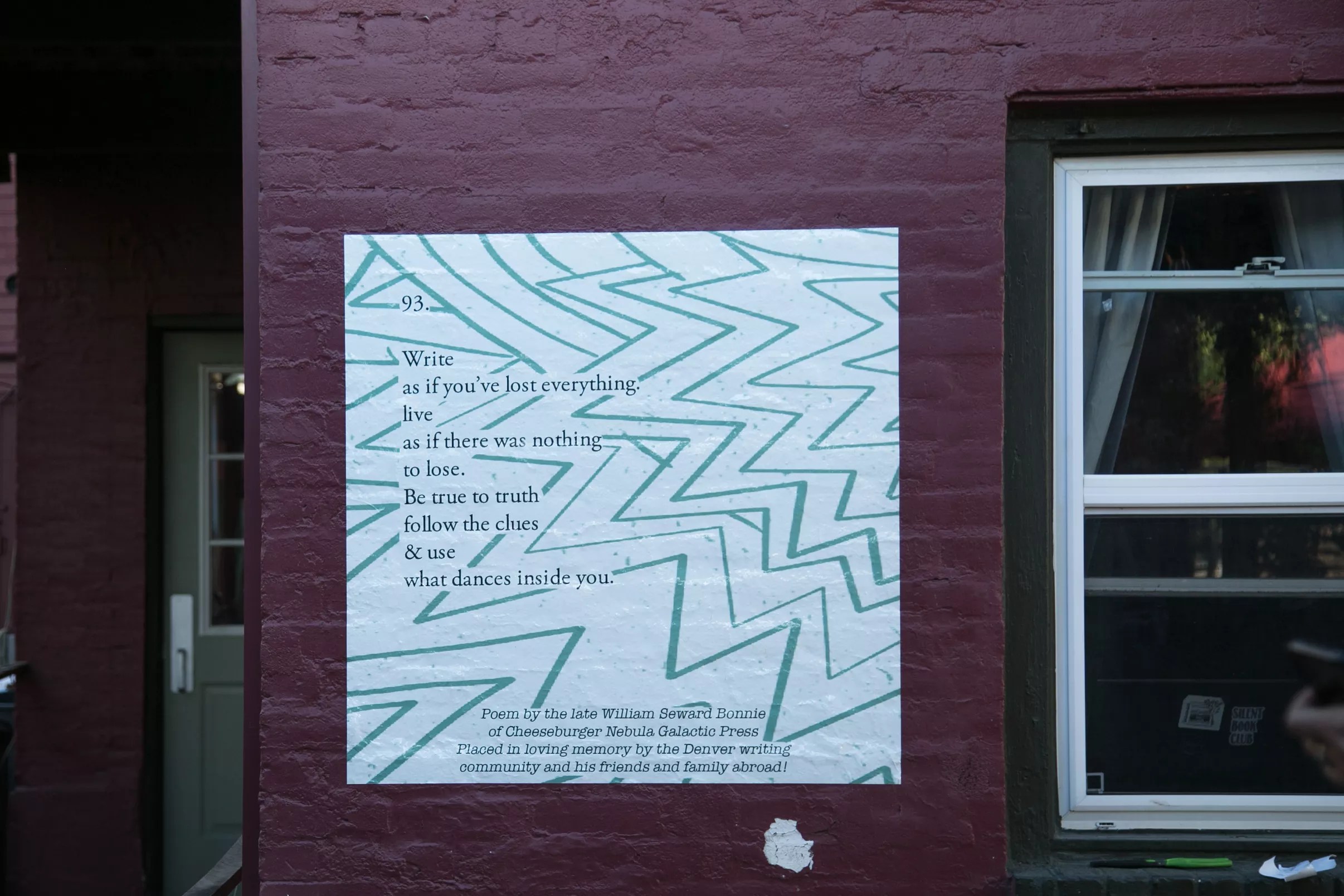 In the past two weeks, large stickers of poems written by Denver poet William Seward Bonnie, who died last November at age thirty, were put up at three Denver locations where he was known for hosting vibrant poetry readings and open-mic events.