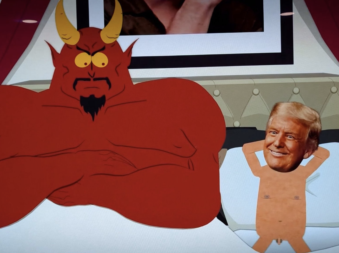 Trump’s minuscule dick – at one point it speaks, with googly eyes attached – features extensively, as DJT gets in bed with Satan at the White House, where he’s trying to cop some action. Satan, who used to date Saddam Hussein, is unimpressed. “You remind me more and more of this other guy I used to date, like a lot,” Satan tells the president. “Like, you guys are exactly alike.”