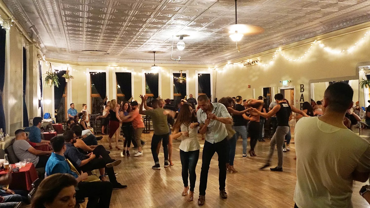 A 2018 Latin social, under the original tin ceiling in the Savoy’s ballroom.