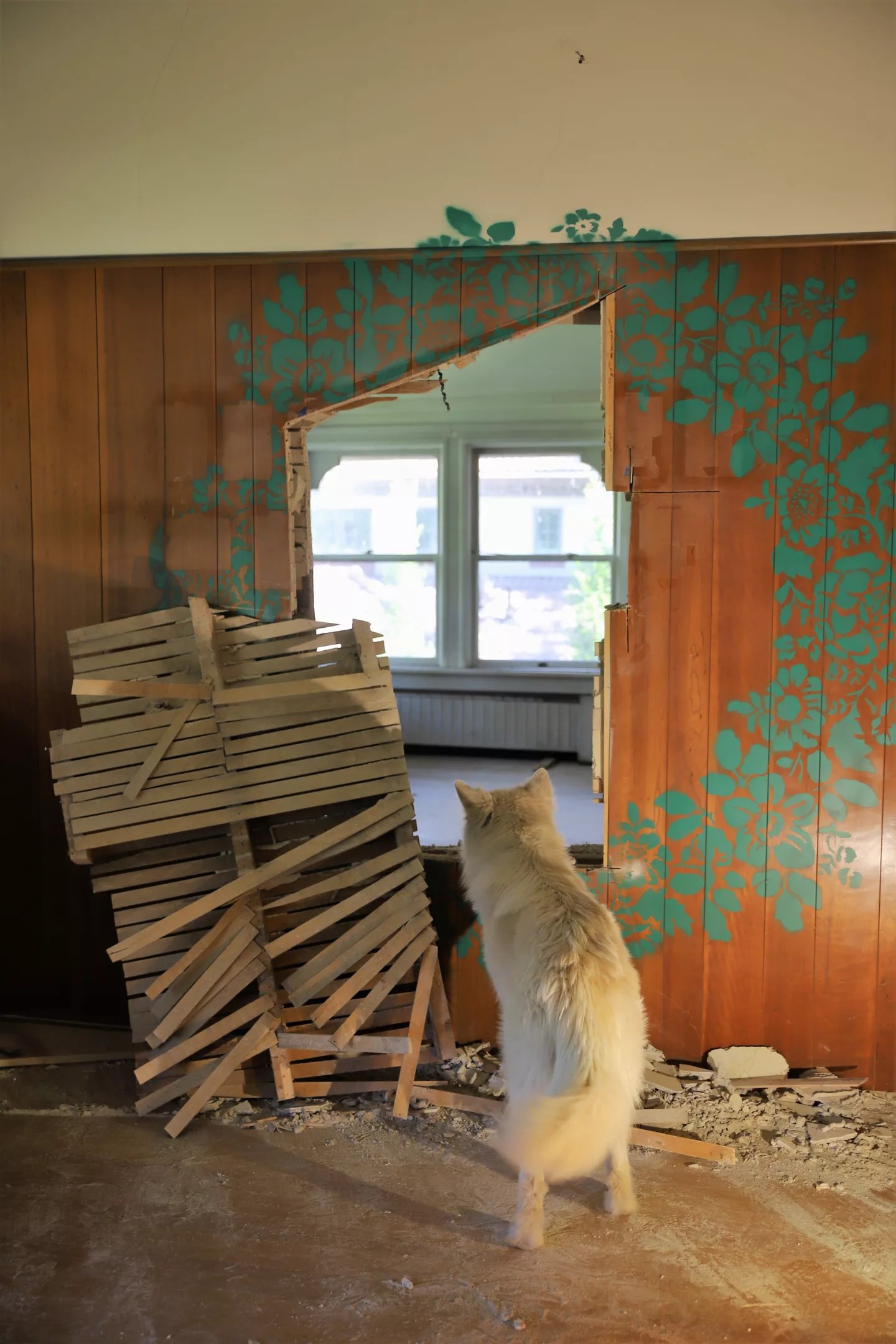 Discovering Seton’s story intersected with Feniak and Friedman’s ideas about the rewilding of architecture – already well demonstrated by growing vines that had taken over the interior of the Hut and wild grasses thriving outside on the lot. The duo collaborated with fellow artist Eileen Roscina to shoot dreamy film footage throughout the house, adding projections to their interventions inside and outside. They brought a live white wolf, Simba, to wander silently through the Hut’s moldering rooms. They gathered fragments of wallpaper and wheat-pasted them to the walls, always documenting their footsteps.