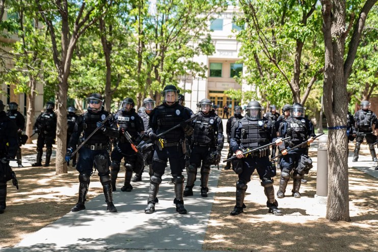 On video captured October 28, an unidentified officer grabs a 57-year-old protester by the hair and throat and throws her down a hill.