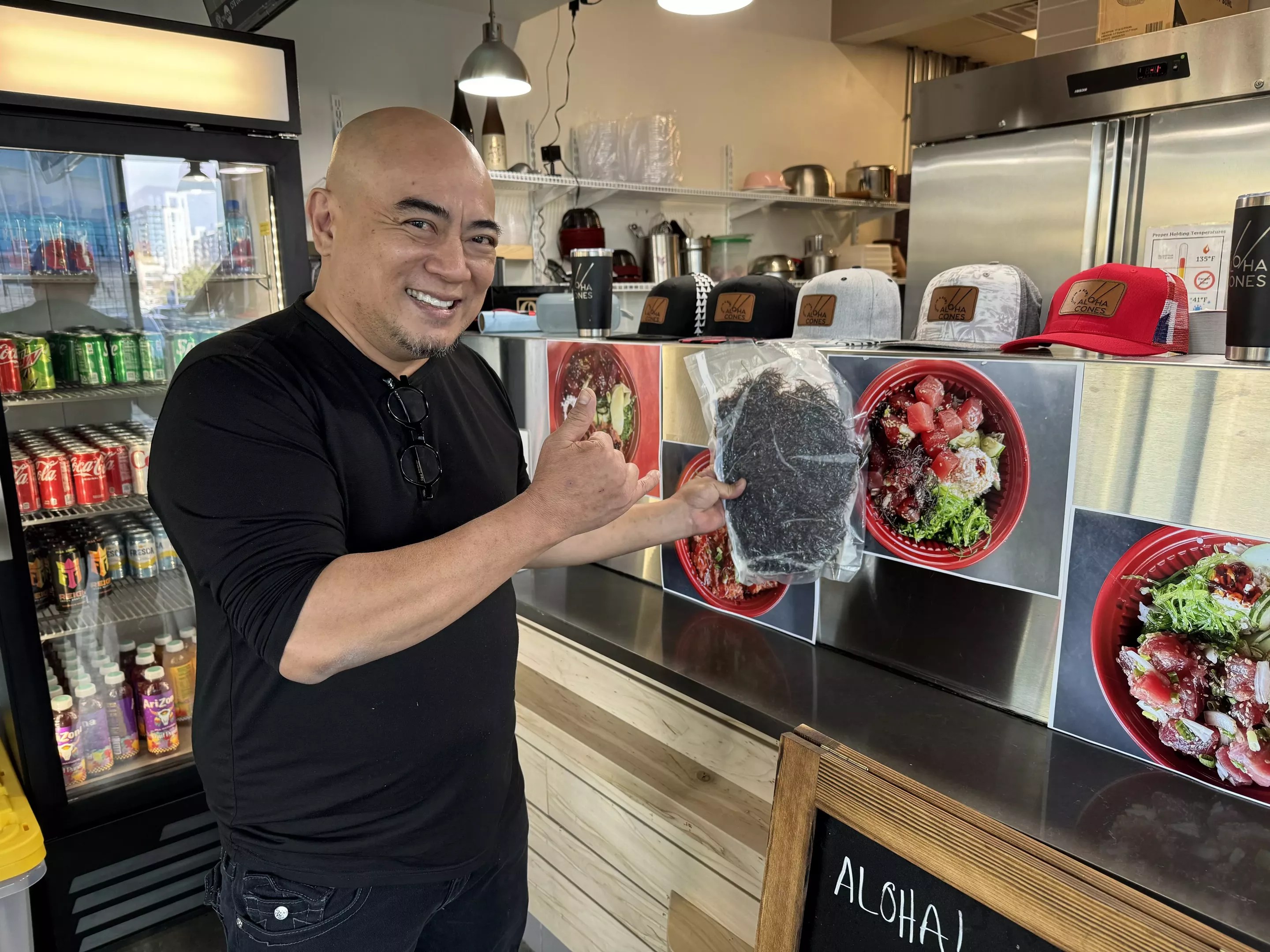 Phillip Phomphakdy holding fresh limu (seaweed), which Aloha Cones imports from Hawaii.