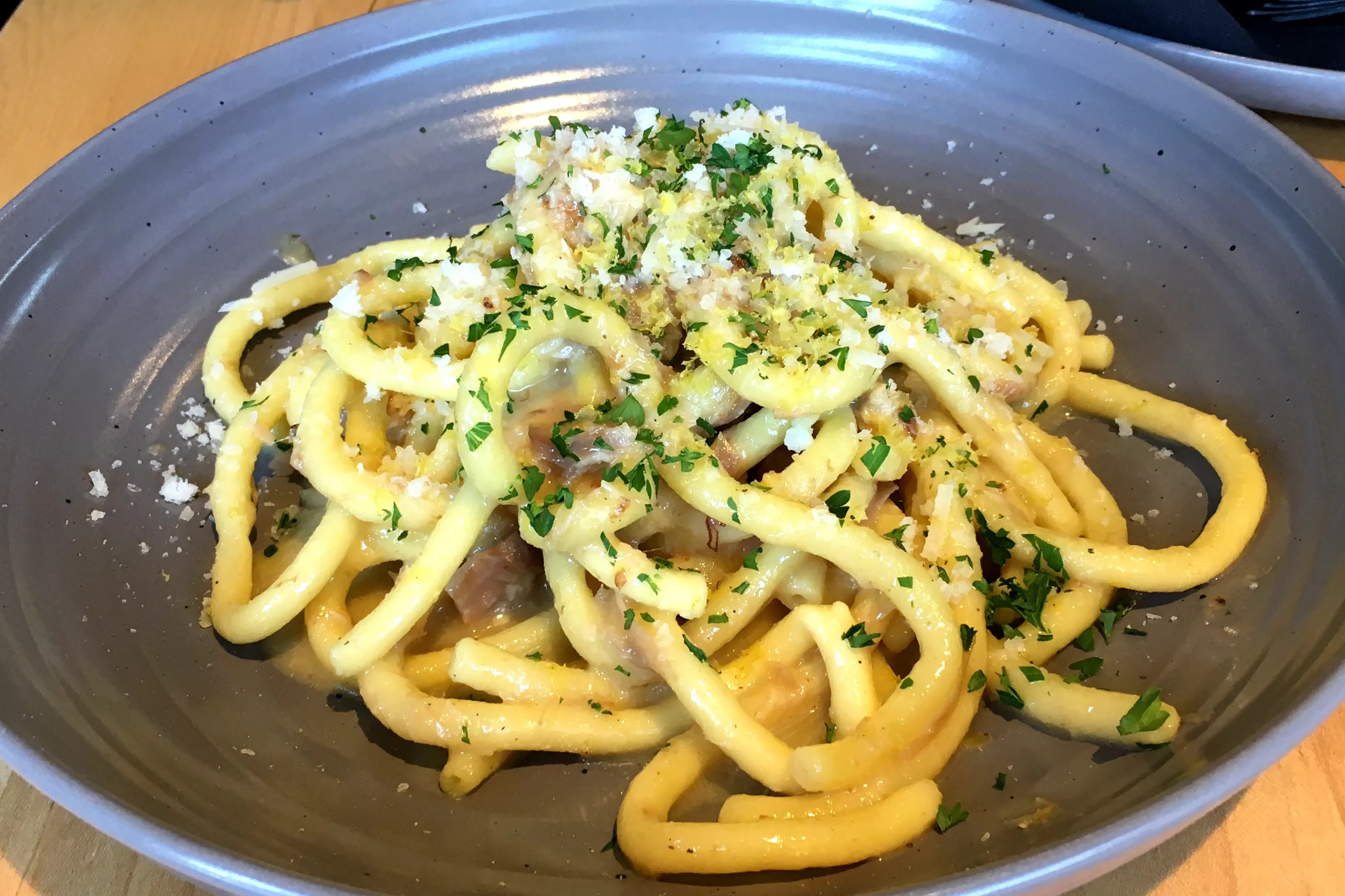 But the deviled eggs hide a smoky secret, and the list of bar snacks also includes “Animal Crackers” – crunchy bits of pork, beef and duck with lime salt and hot sauce. And even something as simple as pasta carbonara gets a bright-yellow dusting of cured egg yolk.