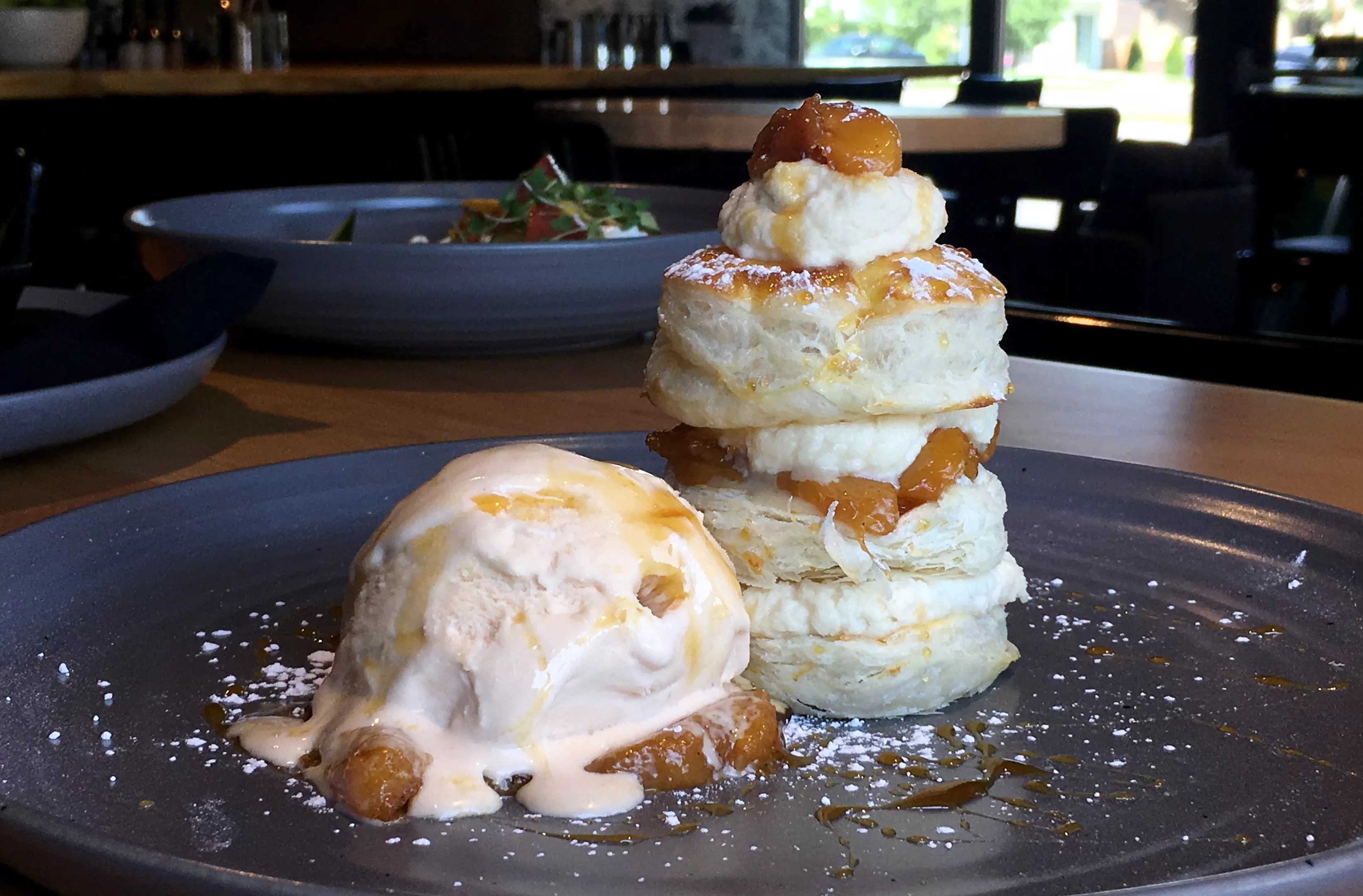 Other items he’s been working on include a tomato salad with hazelnut vinaigrette and creamy stracciatella (a cheese similar to burrata) from Italian cheese import company La Mozzarella, and seared scallops with a hyper-seasonal butter-bean succotash and smoked tomato beurre blanc. The menu descriptions may read as a little complicated, but the ingredients come together seamlessly in a way that’s – as the chef intends – comforting. American Elm’s carbonara uses housemade bucatini – like fat spaghetti with a hole in the middle. Mark Antonation More seasonal produce appears in this peach Napoleon with bourbon-butterscotch ice cream and caramelized honey. Mark Antonation