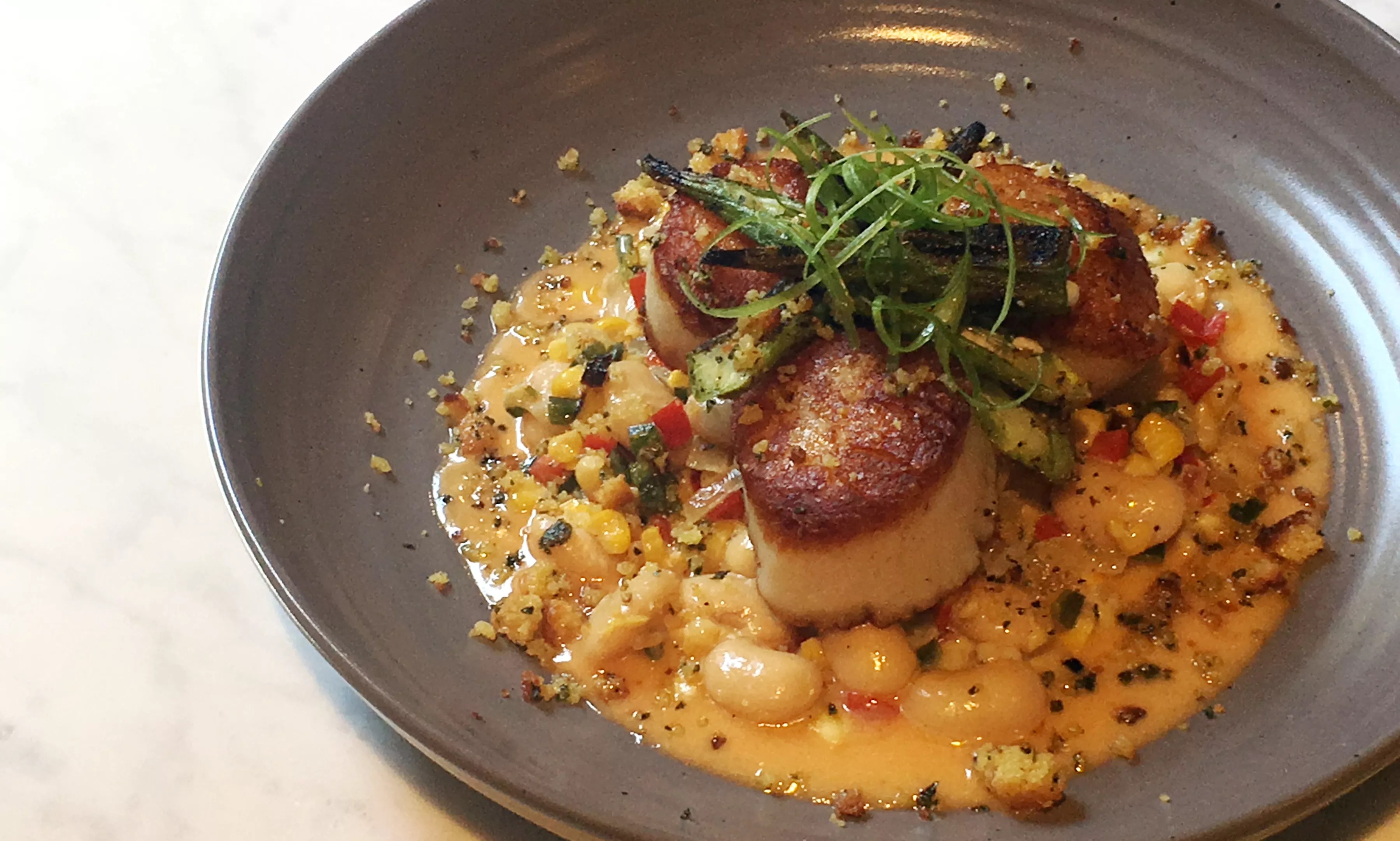 Scallops with butter-bean succotash and smoked tomato beurre blanc.