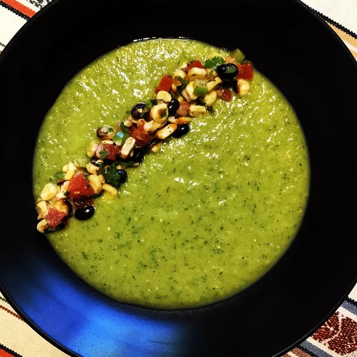 Andrea Murdoch’s roasted tomatillo gazpacho garnished with a charred-corn pico.