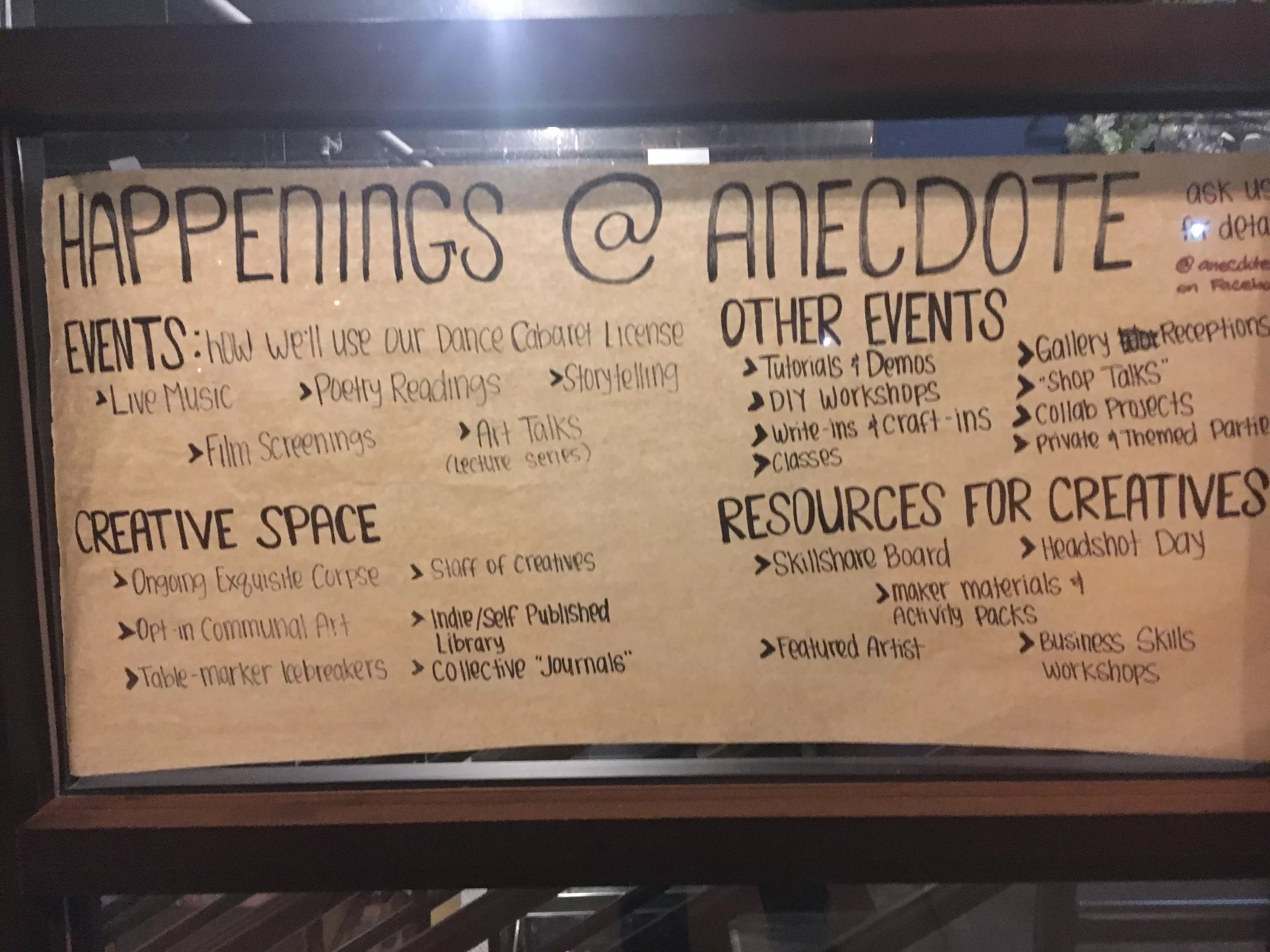 Here are some of the events and ideas planned for Anecdote.