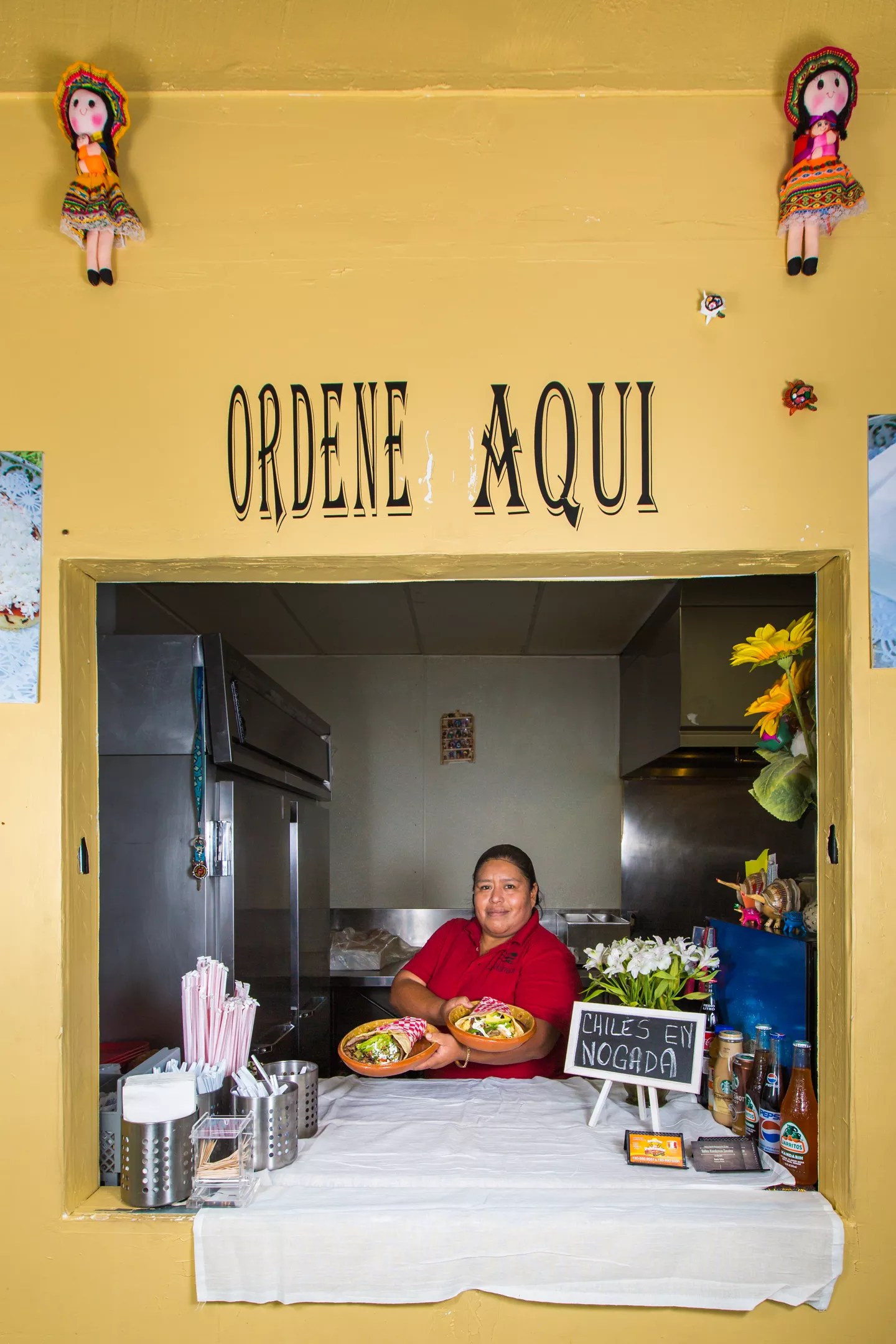 Other distinctly Pueblan dishes include memelas, thick corn tortillas topped with two kinds of salsa and crumbles of cheese; chiles en nogada, poblano chiles stuffed with picadillo and blanketed in walnut sauce; and plátanos fritos, fried plantains served here as dessert with a sauce similar to sweetened condensed milk. Chiles en nogada are a seasonal dish, often served in observance of Mexican Independence Day (September 16) because the colors mimic the Mexican flag (green poblano chiles, white salsa nogada and a sprinkling of red pomegranate seeds).