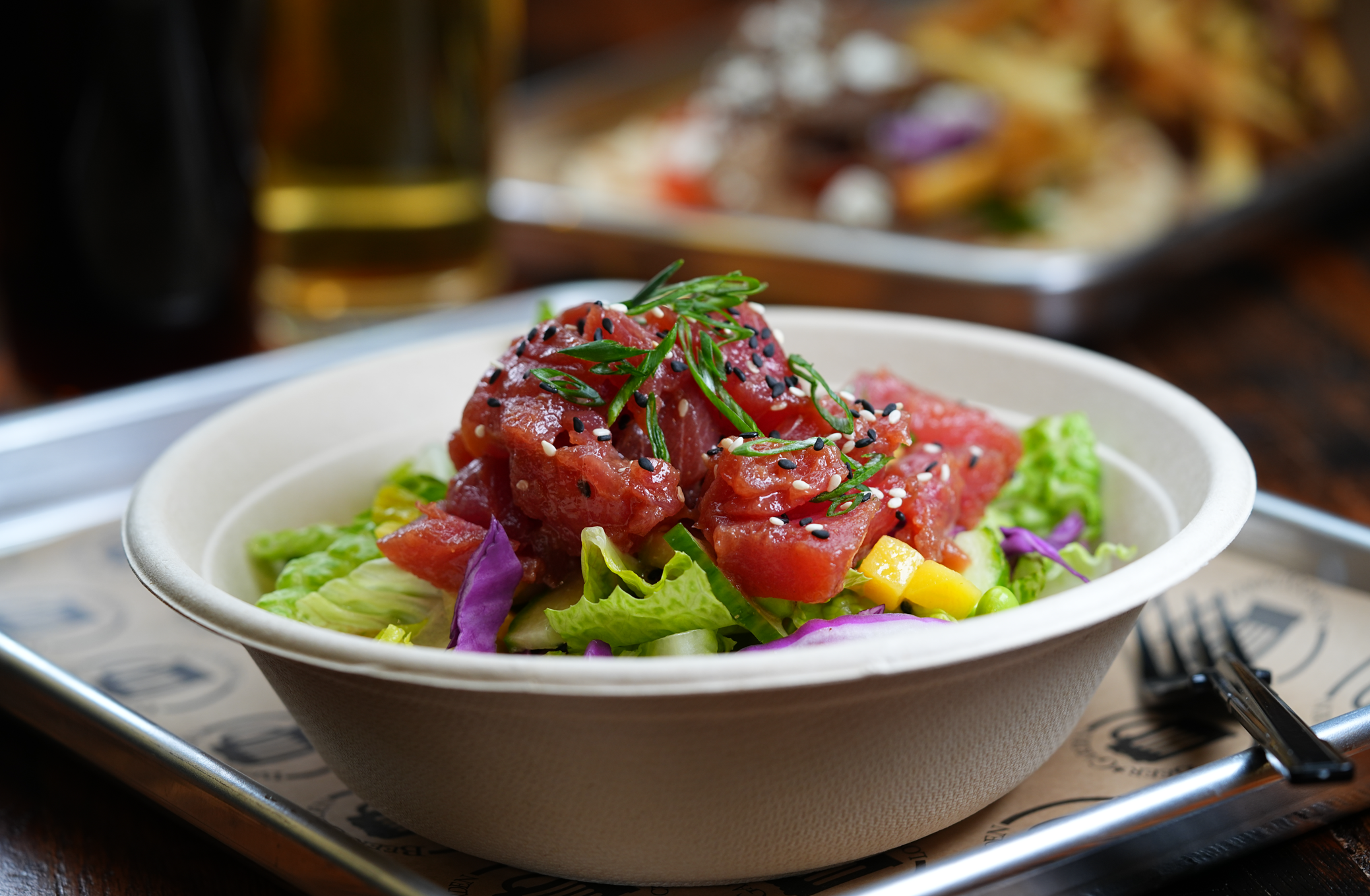 The menu features sandwiches, salads, burgers and more, like this salad topped with poke.