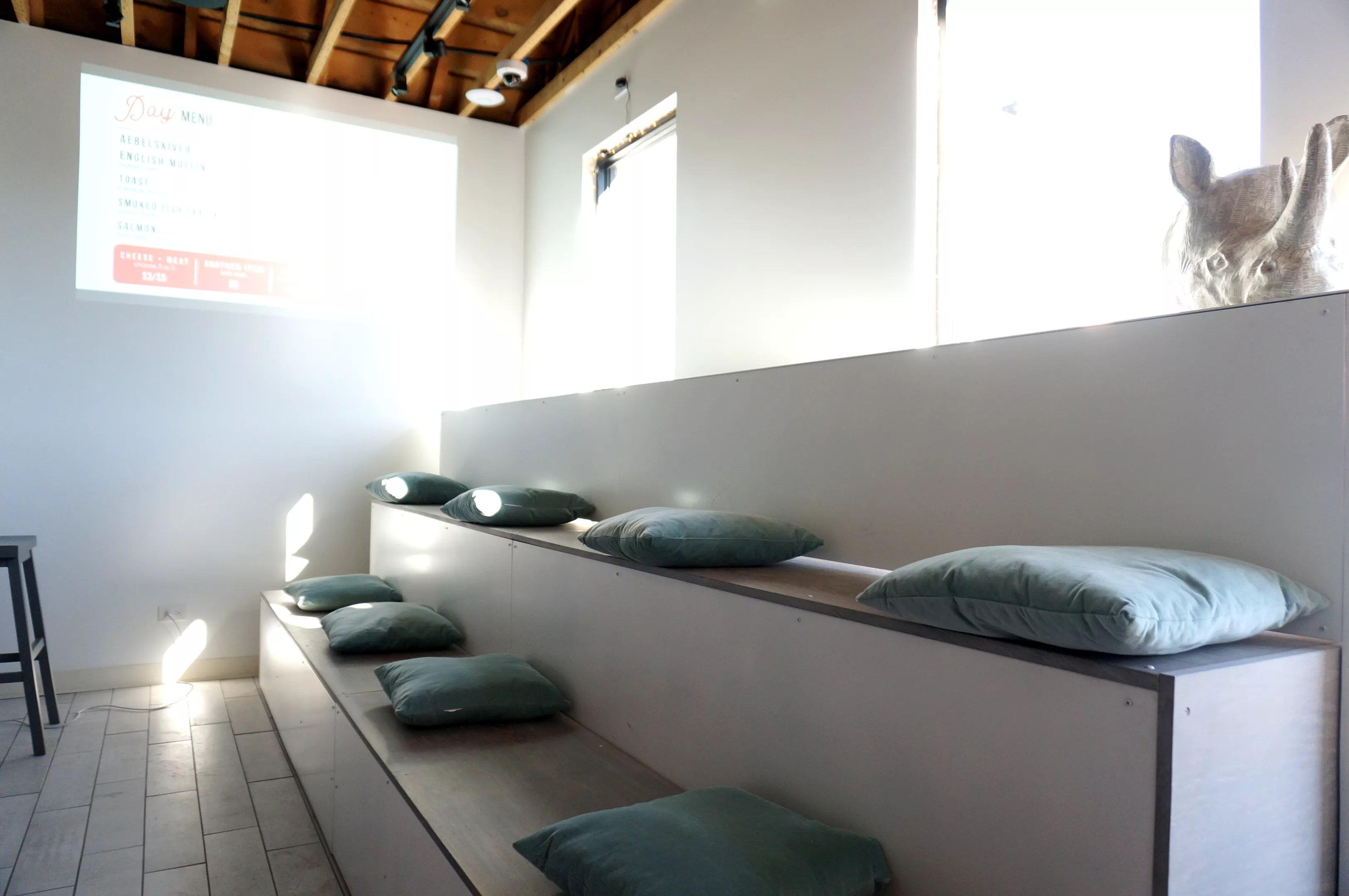 The bleacher seats inside Call retract to form more traditional dining space for dinner.
