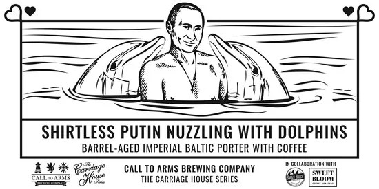 Call to Arms Brewing brings back Shirtless Putin Nuzzling With Dolphins in bottles and on draft at 3 p.m. This 11.7 percent bourbon-barrel-aged imperial Baltic porter was brewed with Sweet Bloom Coffee and “offers flavors of vanilla, oak, and chocolate-covered cherries,” the brewery says. “You can’t un-see the imagery of a scantily clad Vladimir cuddling up to these friendly mammals of the sea,” adds the brewery’s Chris Bell. “It’s a bold image fit for a bold beer.” Shirtless Putin Nuzzling With Dolphins was brewed with Czech Pils yeast and started as the brewery’s Shirtless Putin on a Horse. Seven different malts were blended and used in the original brew, along with the addition of Bravo hops. The beer was then aged in Four Roses bourbon barrels for months. Coffee was added as the finishing touch. There are only 400 bottles available.