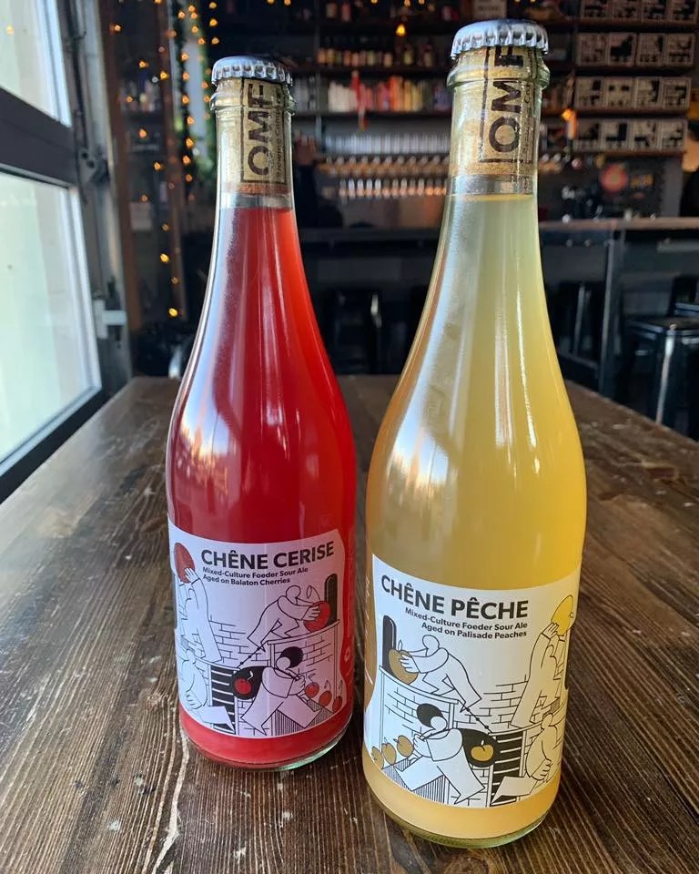 Our Mutual Friend Brewing Chêne Cerise and Chêne Peche Sour Ales: The base for these two brightly-colored beers was fermented in French oak foeders for ten months. Next it was refermented on either Balaton cherries or Colorado grown peaches at at four pounds per gallon. It was then bottle conditioned. Because the brewery used only a minimal amount of aged hops in these beers, it was able to show off the colors by putting them in clear bottles – without worrying about the effects of light on the hops.