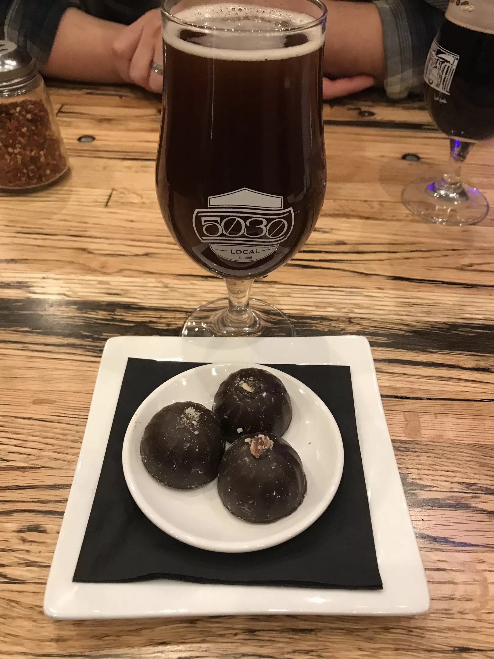 Local dark-chocolate truffles pair with Fireside Barrel-Aged Railbender.