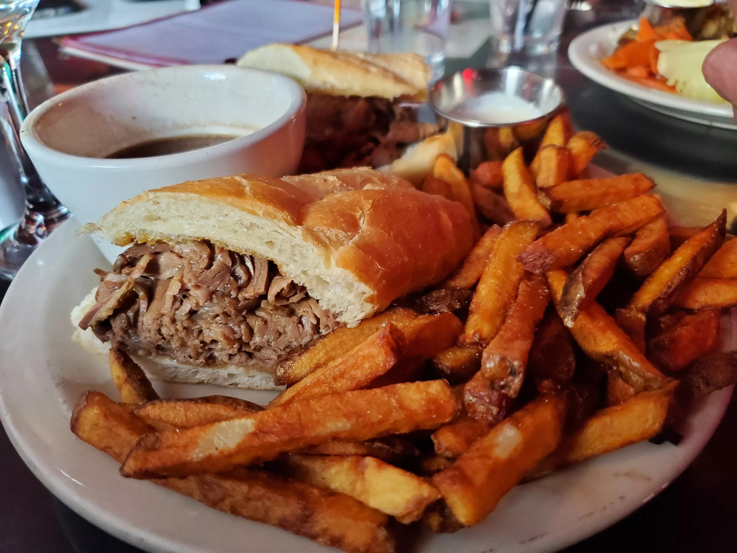 I also doubled up on two outstanding French dips, which might knock off some of the selections on our current top-ten list for this classic sandwich. The first was at Poppie’s, an old-school strip-mall spot on South Colorado Boulevard. This is a traditional version through and through – just thin sliced prime rib (a specialty here) on a soft baguette with a big side of rich jus, crispy fries and creamy horseradish sauce. Molly Martin