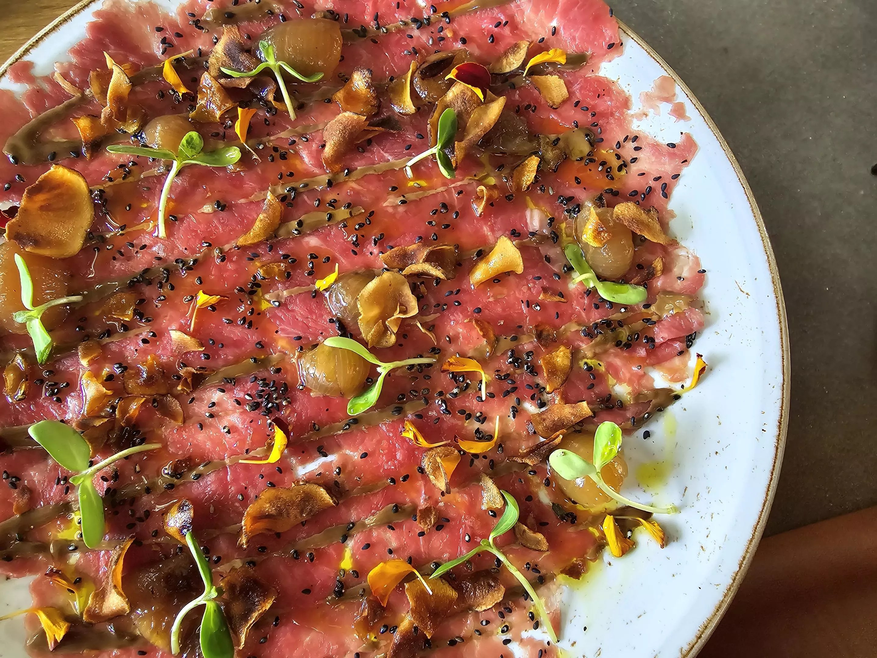 Xiquita, the much-anticipated Mexican restaurant from the team behind Lucina, debuted in Uptown at the end of July, and yes, the hype is real. Masa takes center stage, and diners at the bar have a view of the tortilla-making process. There’s a lot to explore on the menu, but if you go for just one thing, order the taco de pato. “It’s an evolution of Lucina’s pato con mole,” says co-owner Erasmo Casiano, and it’s a damn delicious evolution. The warm tortilla nixta is topped with housemade mole and a pile of shredded and fried duck. Pickled red onion, fresh lime and dots of sweet potato cream add a bright pop to this decadent take on a taco. Beef carpaccio from the Greenwich. Molly Martin