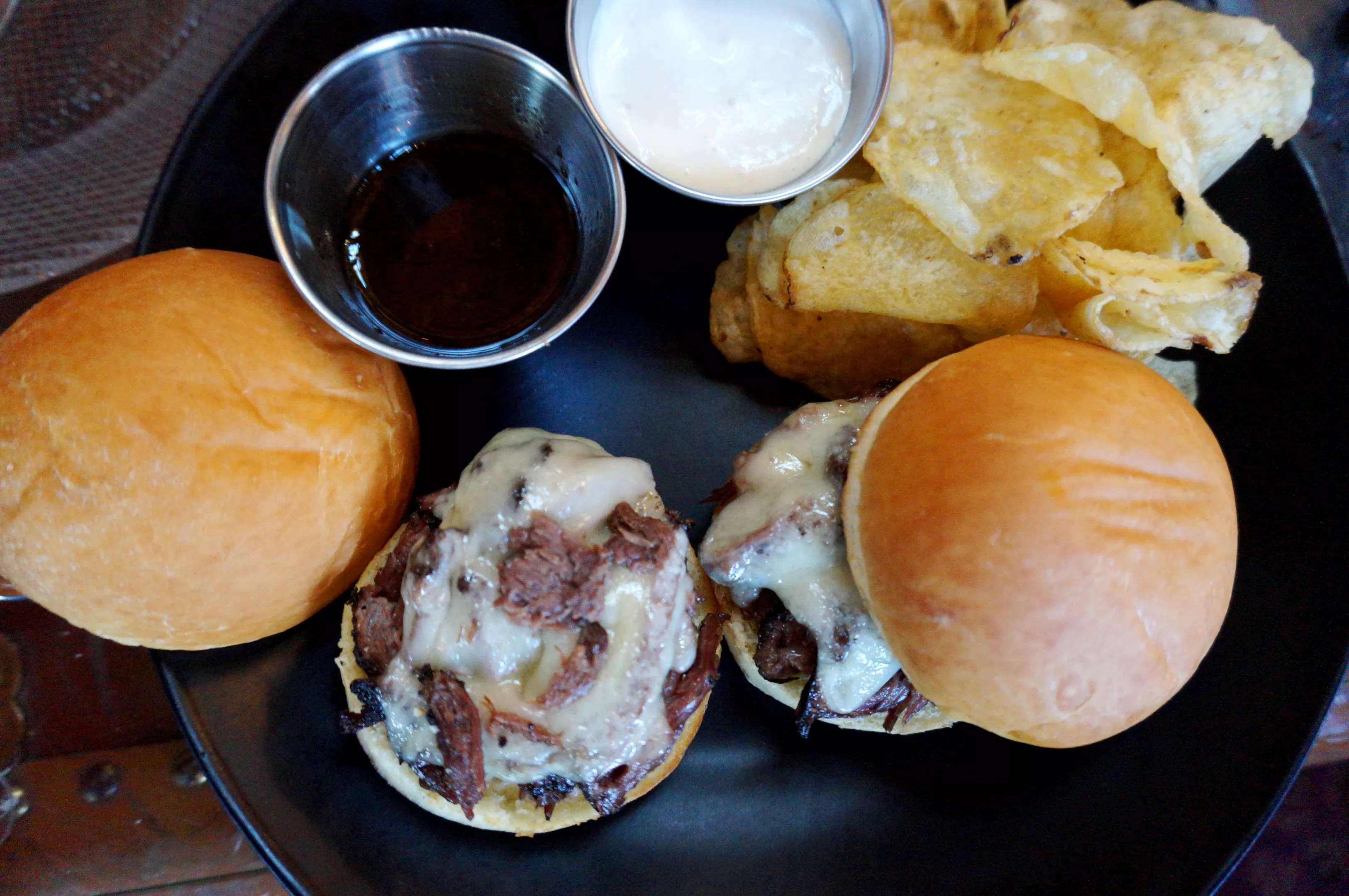 Braised short-rib French dip sliders.