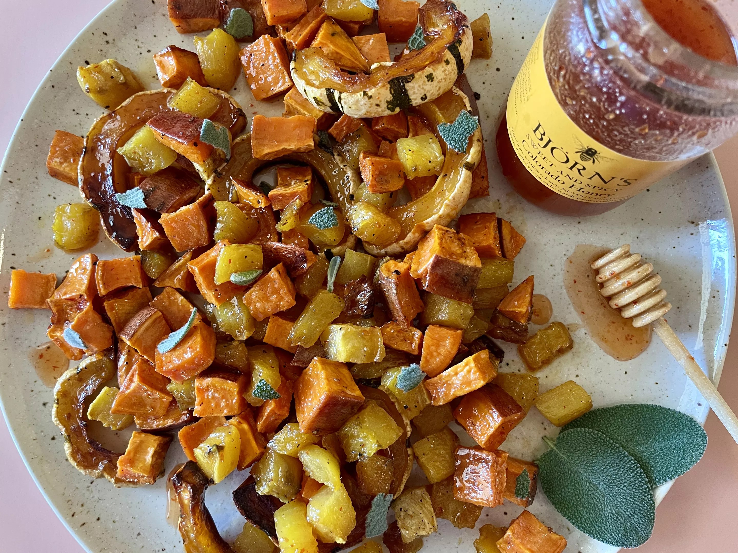 Roast your favorite autumn vegetables (pictured here: sweet potatoes, golden beets and delicata squash) and drizzle with Sweet and Spicy Honey for the last five minutes of roasting to glaze.