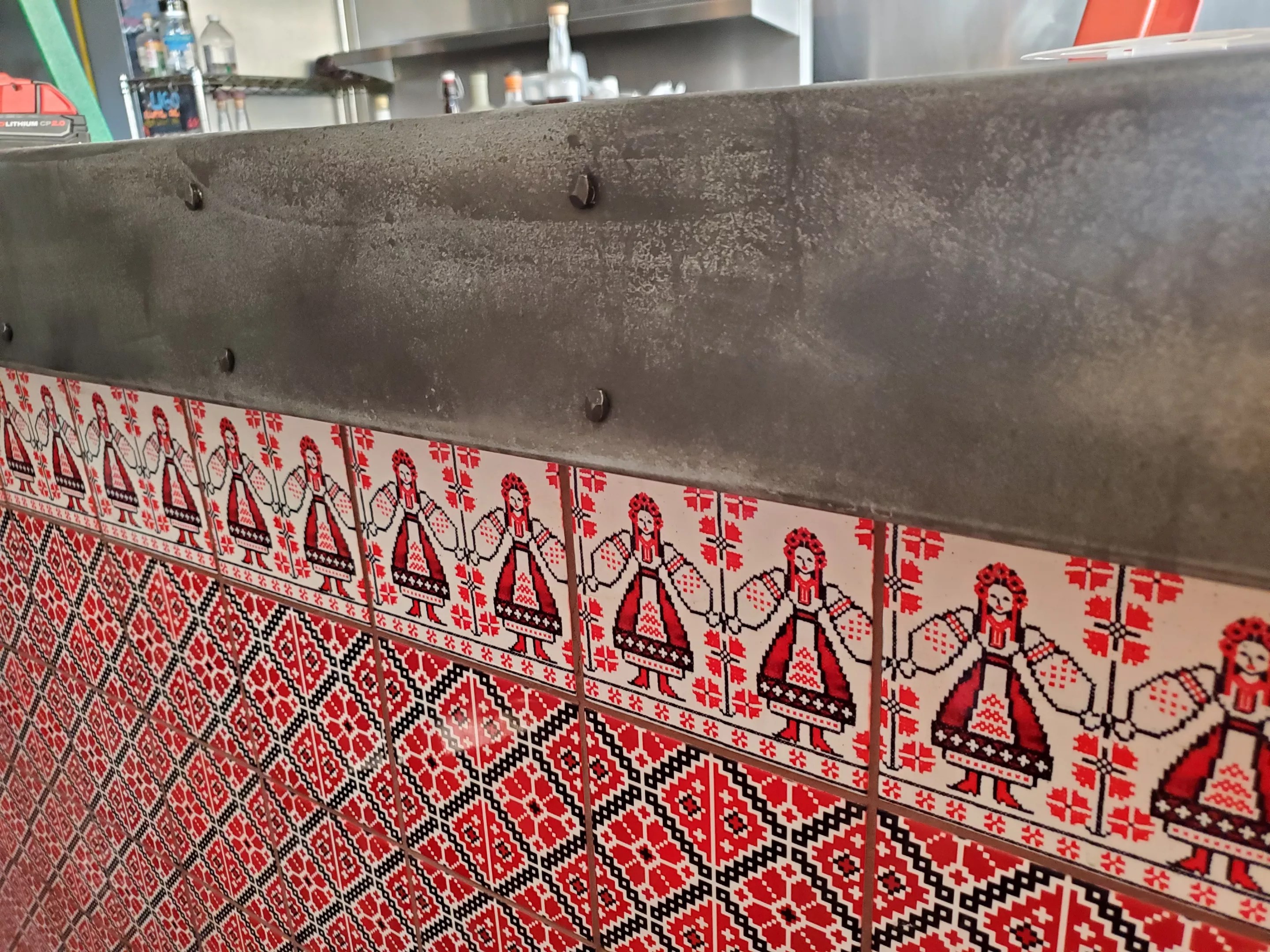 Updates, including new tile featuring a Ukrainian embroidery pattern, are underway in the space.