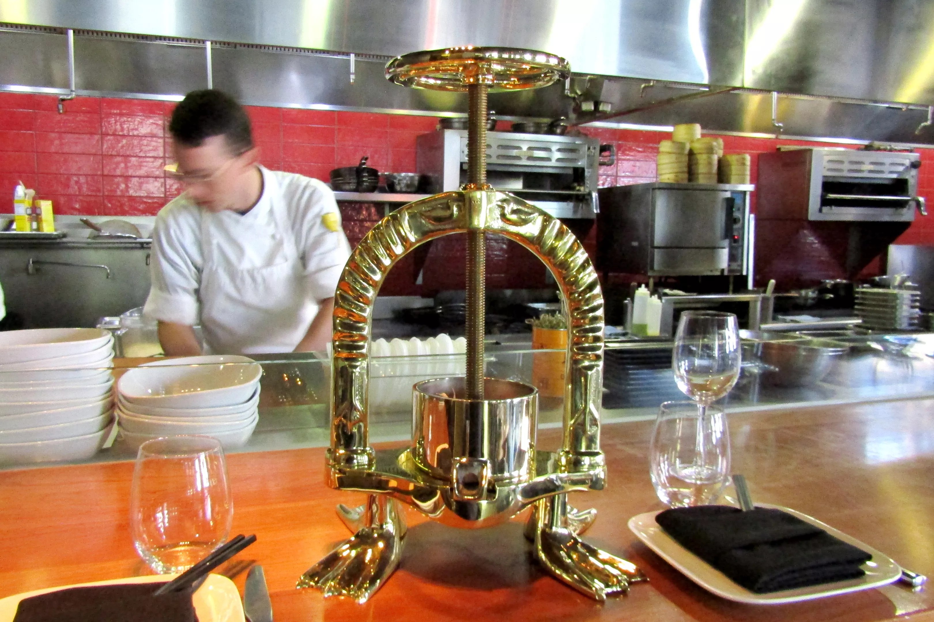 Also new at ChoLon is a mysterious piece of kitchen equipment that recently arrived in the mail from France. It’s a duck press, standing on four gold-plated duck feet and weighing upwards of thirty pounds. Symensma learned how to use the device when he was a student at the Culinary Institute of America in Hyde Park, New York, in the late 1990s, and later got to see it in action in restaurants in France, where he worked as a chef and student-teacher.