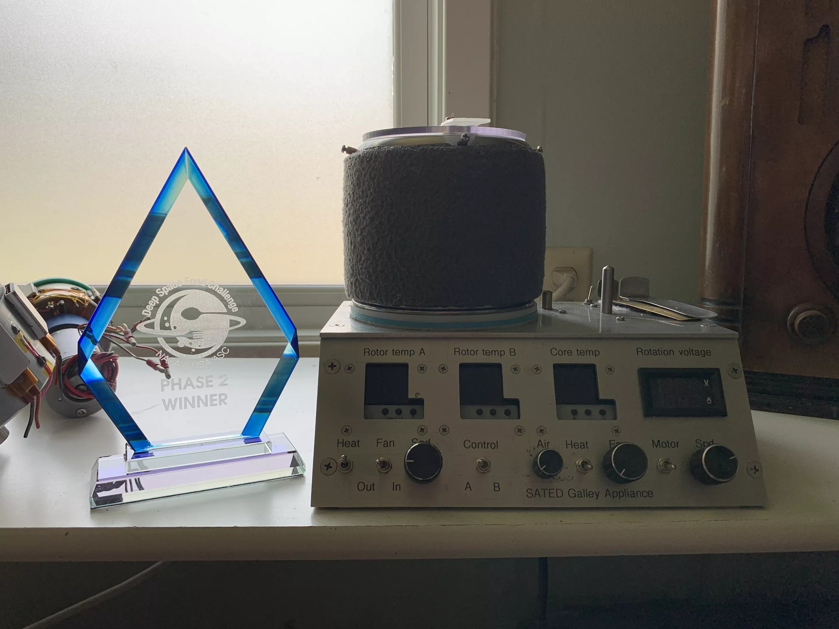 In addition to new heaters, Sears experimented with replacing rotors, putting in more powerful motors and using an inserted heating element. In the corner of his garage is a shelf where all the iterations of the SATED oven are neatly lined up in chronological order, left to right. It begins with the humble tuna can and ends with a fully functional oven replete with PTC heaters and sensors mounted on a base with an analog control board. Tucked behind the machine is a small glass plaque engraved with the words “NASA & CSA/ASC Deep Space Food Challenge: Phase 2 Winner.”