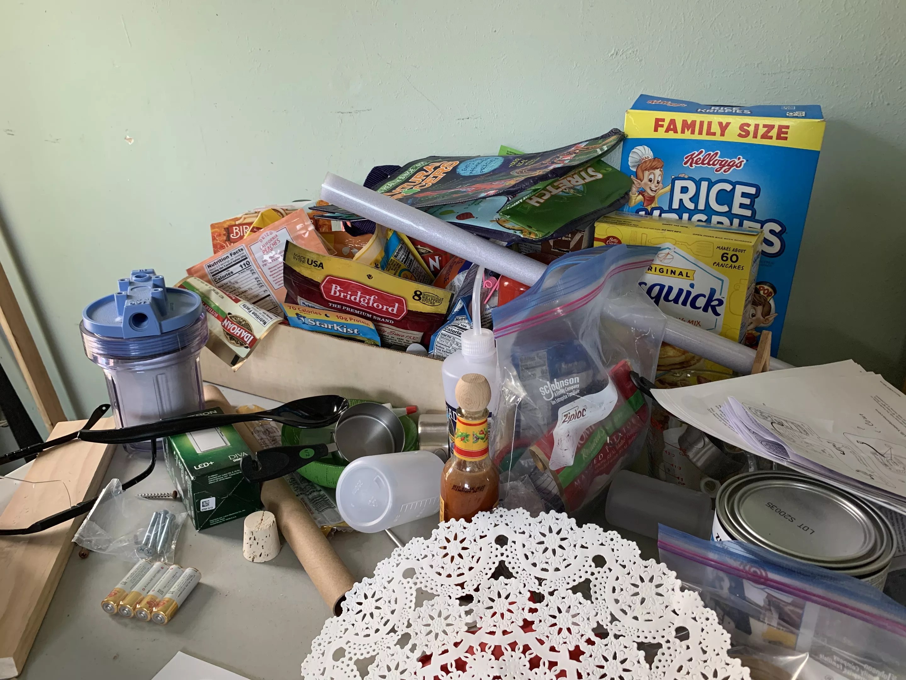 An overflowing cardboard box of ingredients in Jim Sears’s garage.