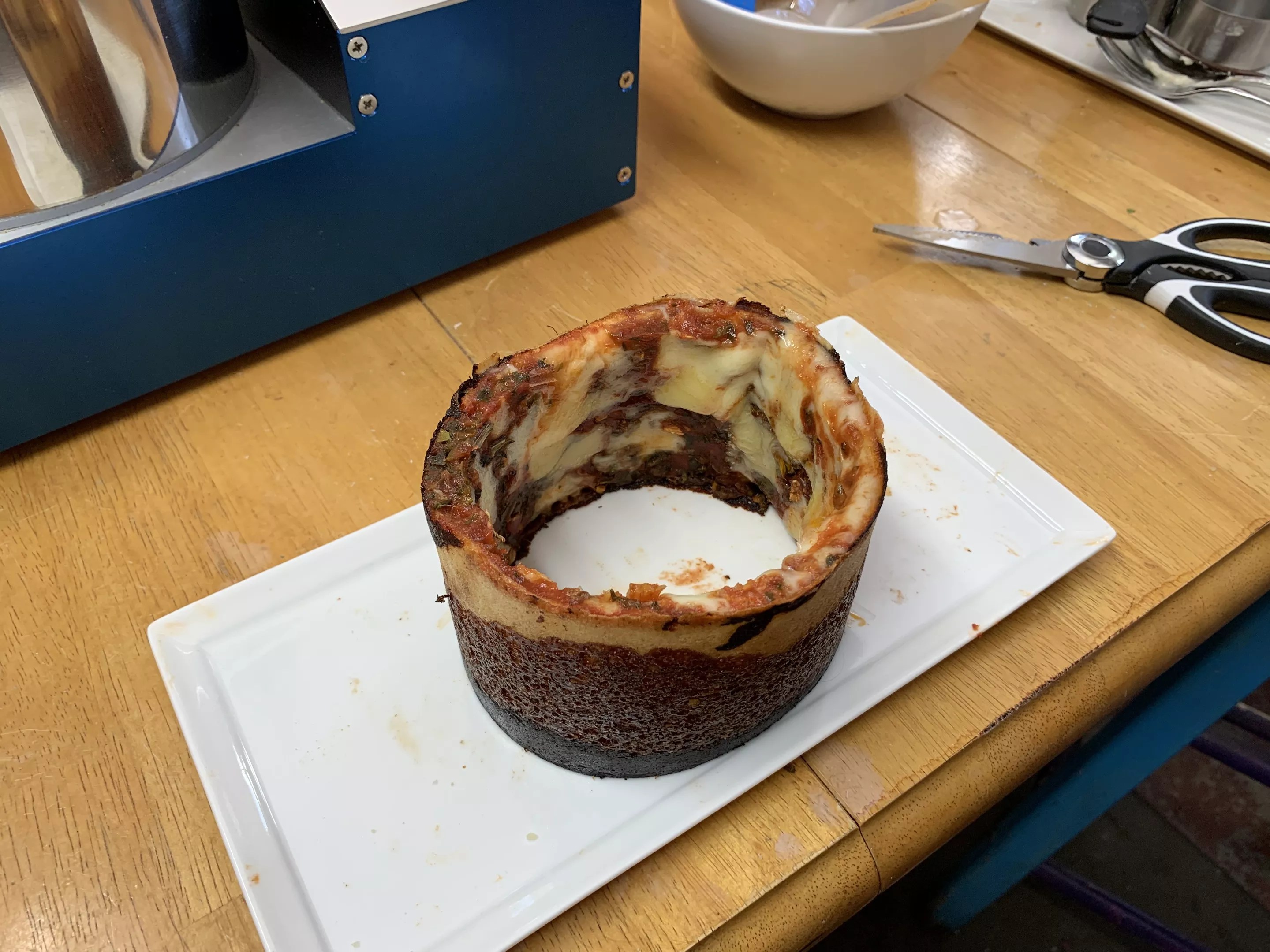 He was trying to counteract the effects of gravity so the Bisquick mixture would evenly coat the sides of the cylinder versus forming more of a cone shape. We watched the mixture spin round and round for the next five minutes. After opening the lid, Abuhamad poked the dough with a gloved finger and announced that it was cooked. He poured the pizza sauce in and, after a few minutes, he used scissors to cut small pieces of mozzarella string cheese into the cylinder, where the centrifugal force pushed it to the sides.