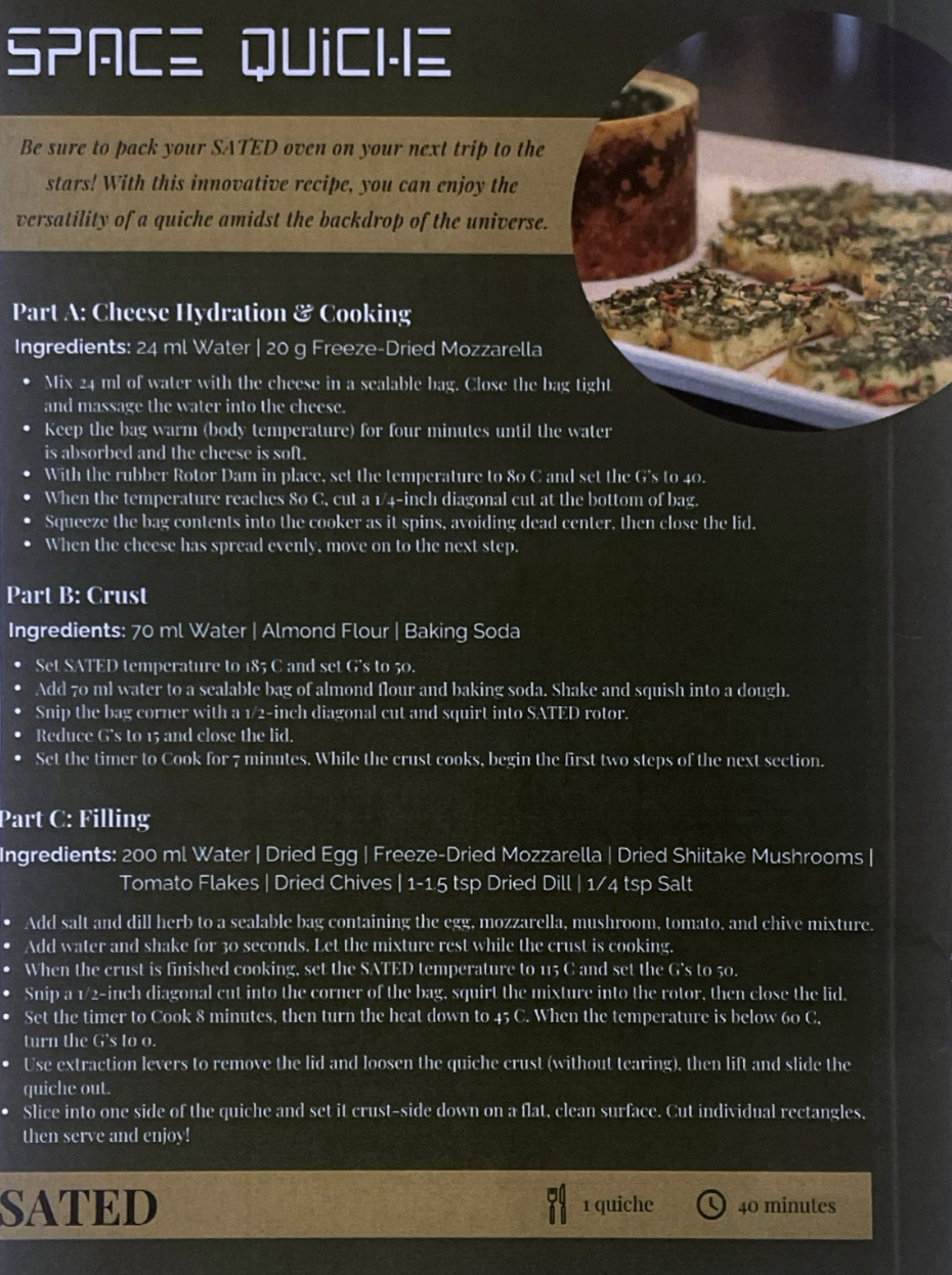 He was given two days to debrief and train his Simunauts. He gave them a one-page recipe for his space quiche, an almond-crusted quiche with freeze-dried mozzarella, shiitake mushrooms, tomatoes, chives and dill. It reads a little differently than a normal cookbook recipe, with instructions to “set the temperature to 80 C and set the G’s to 40. … Squeeze the bag contents into the cooker as it spins, avoiding the dead center, then close the lid.”