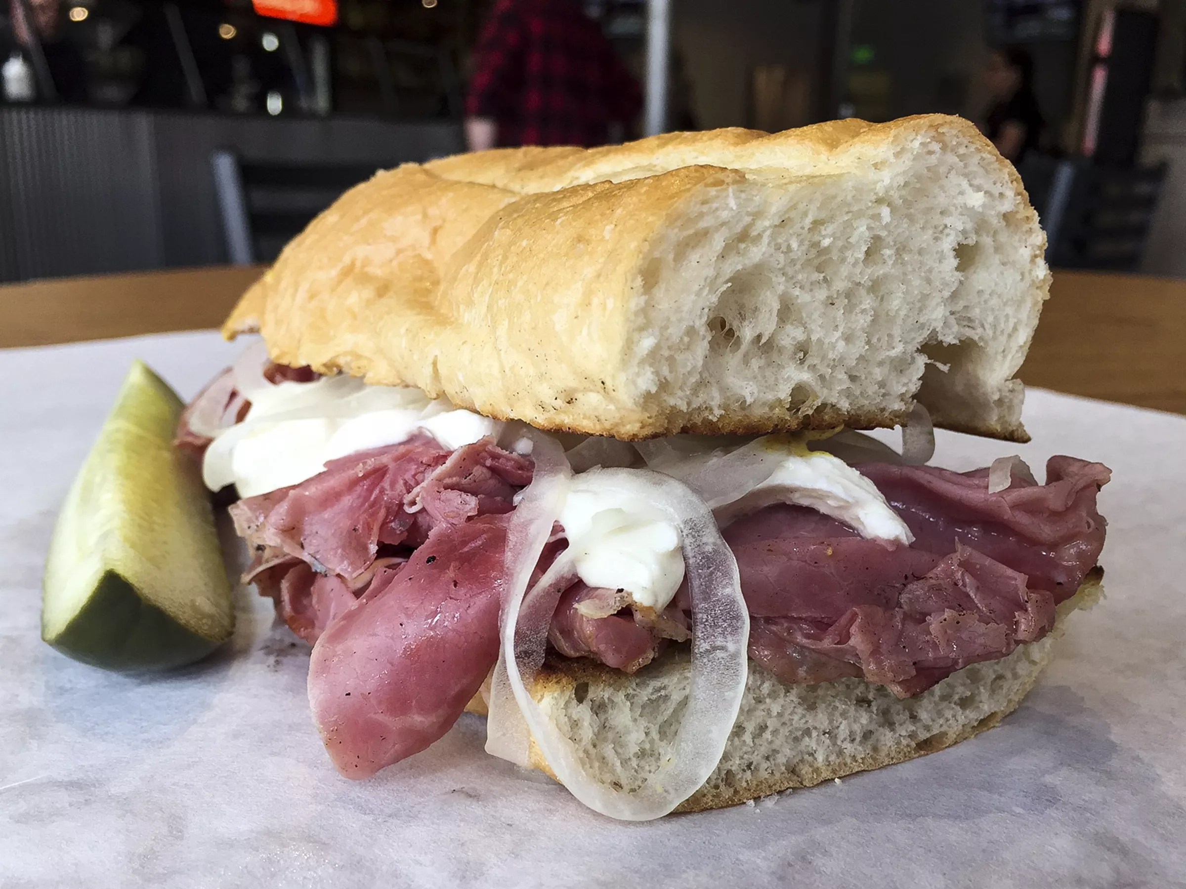 The hot corned beef sandwich with fresh mozzarella cheese, coarse brown mustard and shaved white onions at Broadway Deli.