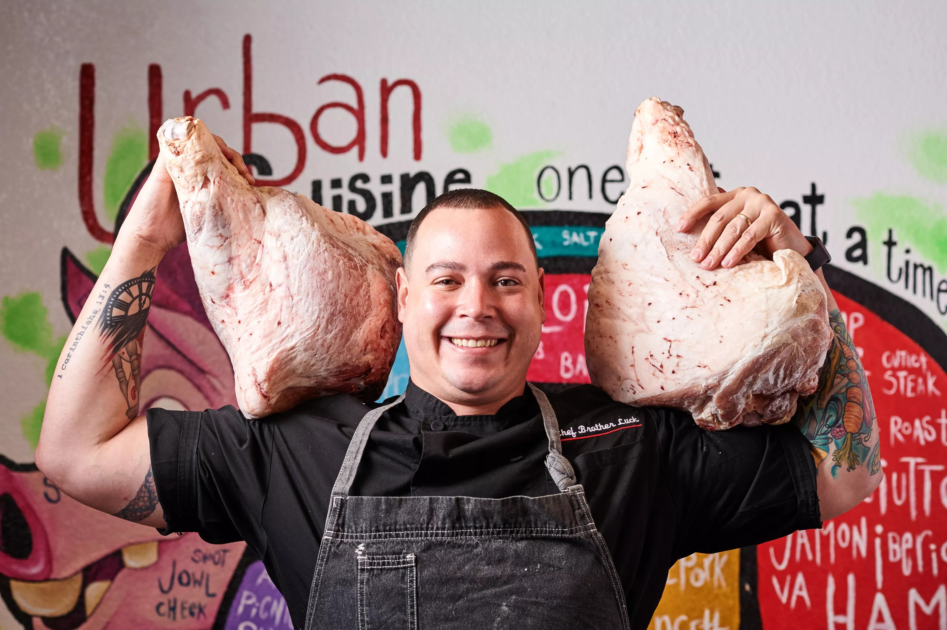 Luck, who’s the fourth generation to bear the name (although the first to have it listed on his birth certificate; the previous three generations were officially named Marcellus Luck), is the chef/owner of Brother Luck Street Eats in Colorado Springs, where the menu is inspired by street food from around the world. Luck appeared on the “Beast Feast” episode of Chopped, which first aired on November 22 last year. Although he didn’t win, the chef says that the experience changed the way he felt about food television. After previously turning down a visit by Guy Fieri and his Diners, Drive-ins and Dives film crew, Luck continued to hear friends and customers tell him that he should be on television. Eventually he relented and was accepted by the producers of Chopped; he’s also made an appearance on the network’s Beat Bobby Flay. (Spoiler alert: Luck fares better here than on Chopped.)