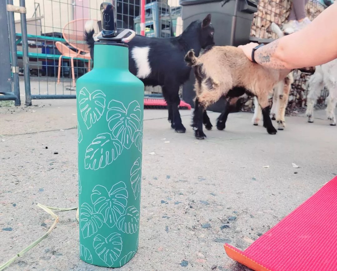 BrüMate withstands the curiosity of goats during baby goat yoga.