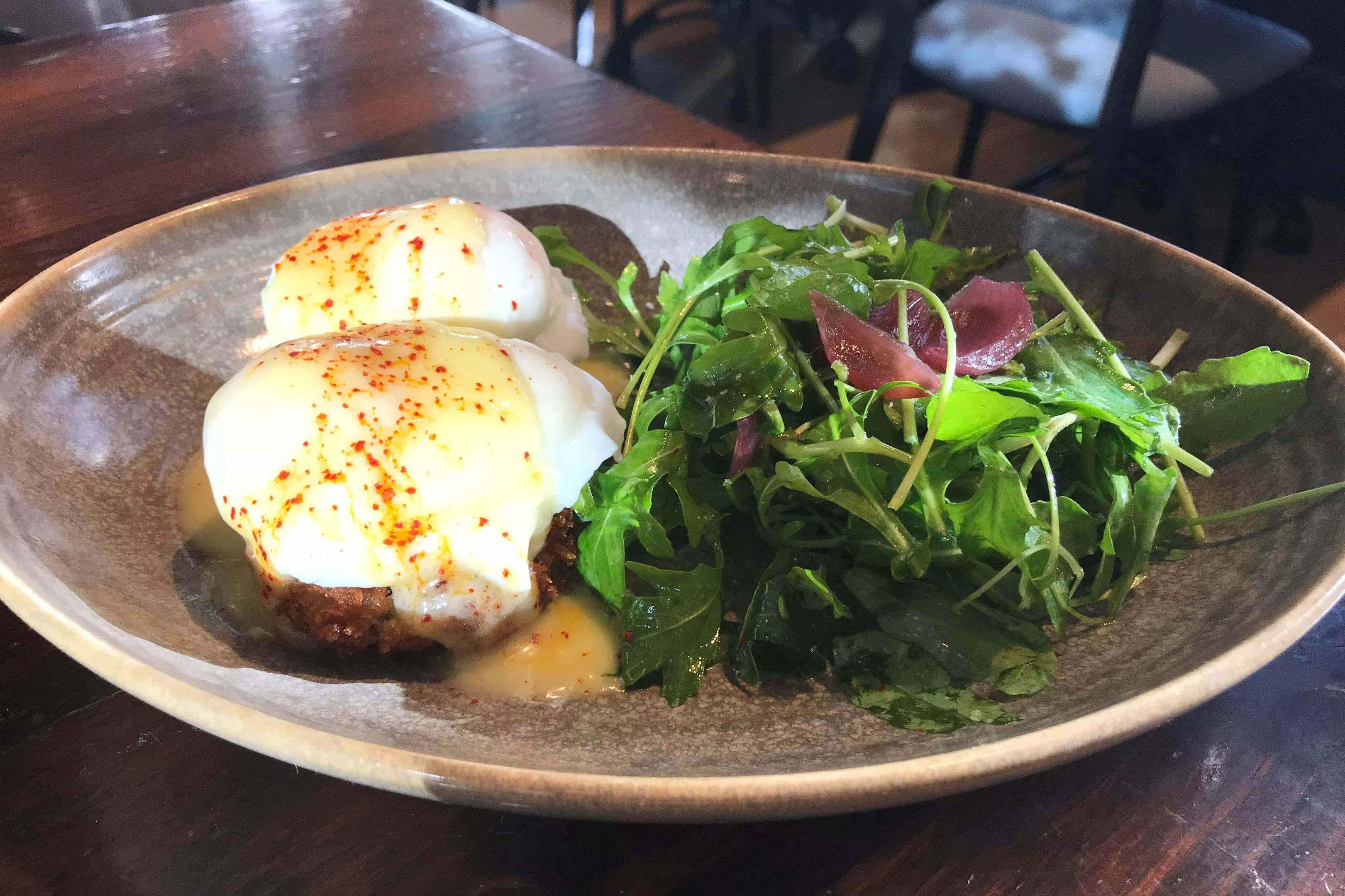 Fishy brunch comes in the form of a crab cake Benedict and a salmon salad. The Maryland Benedict places poached eggs on crunchy crab cakes, all topped with Hollandaise. An arugula salad on the side adds a hint of bitterness. The salmon salad, made with house-smoked salmon, sits on a latke with lemon-caper crème fraîche and a poached egg. The dish is surprisingly light, considering the rich fish, sauce and egg sharing a plate with fried potatoes.