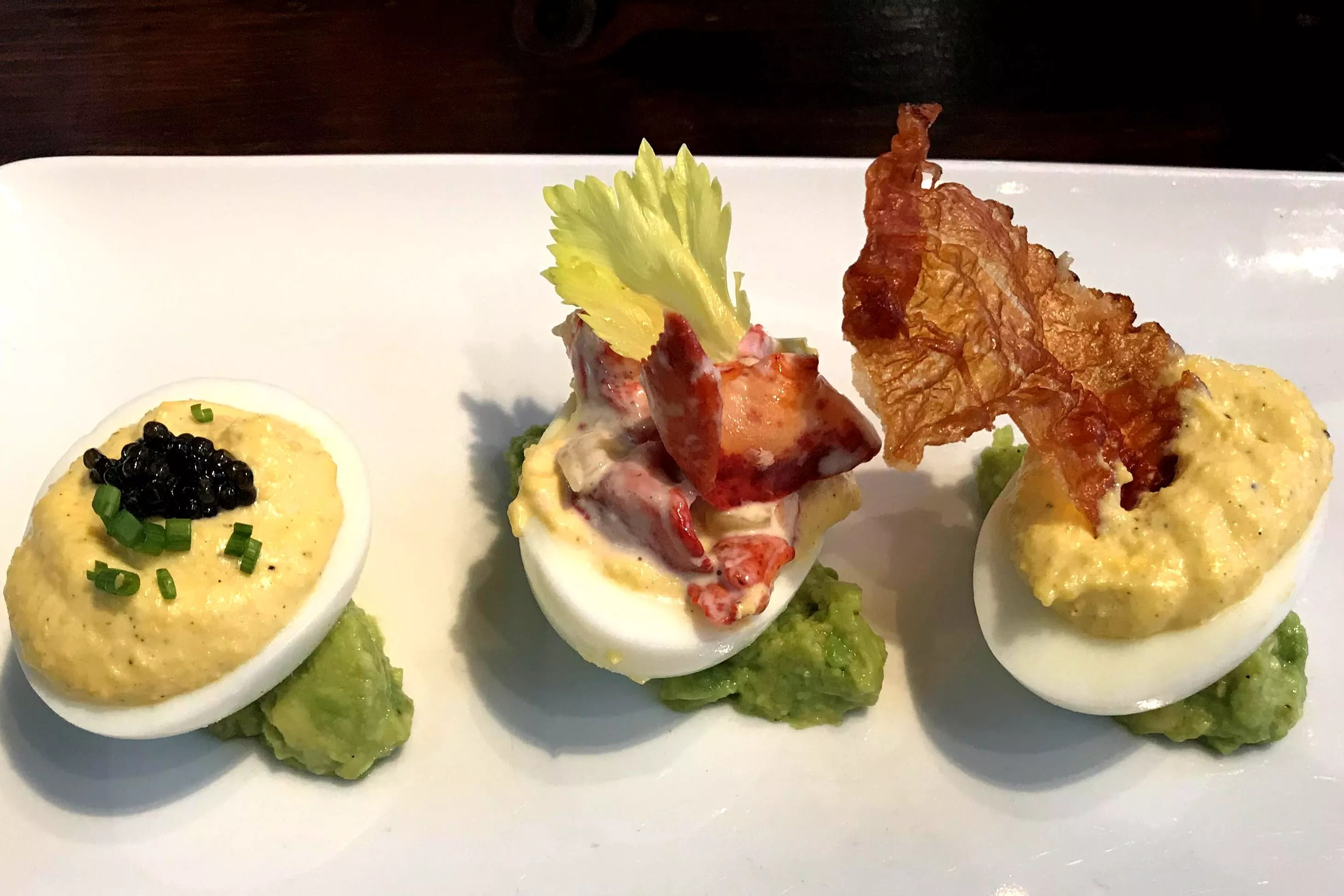 If you like deviled eggs and are ready for a twist on the classic, the deviled egg trio is a great way to experiment. The first is topped with crispy speck (like smoked prosciutto), the second with lobster and the third with caviar. These deviled eggs are a bit spicier than those in traditional recipes, but the added “deviling” makes an excellent complement to the savory garnishes, especially the salty caviar.