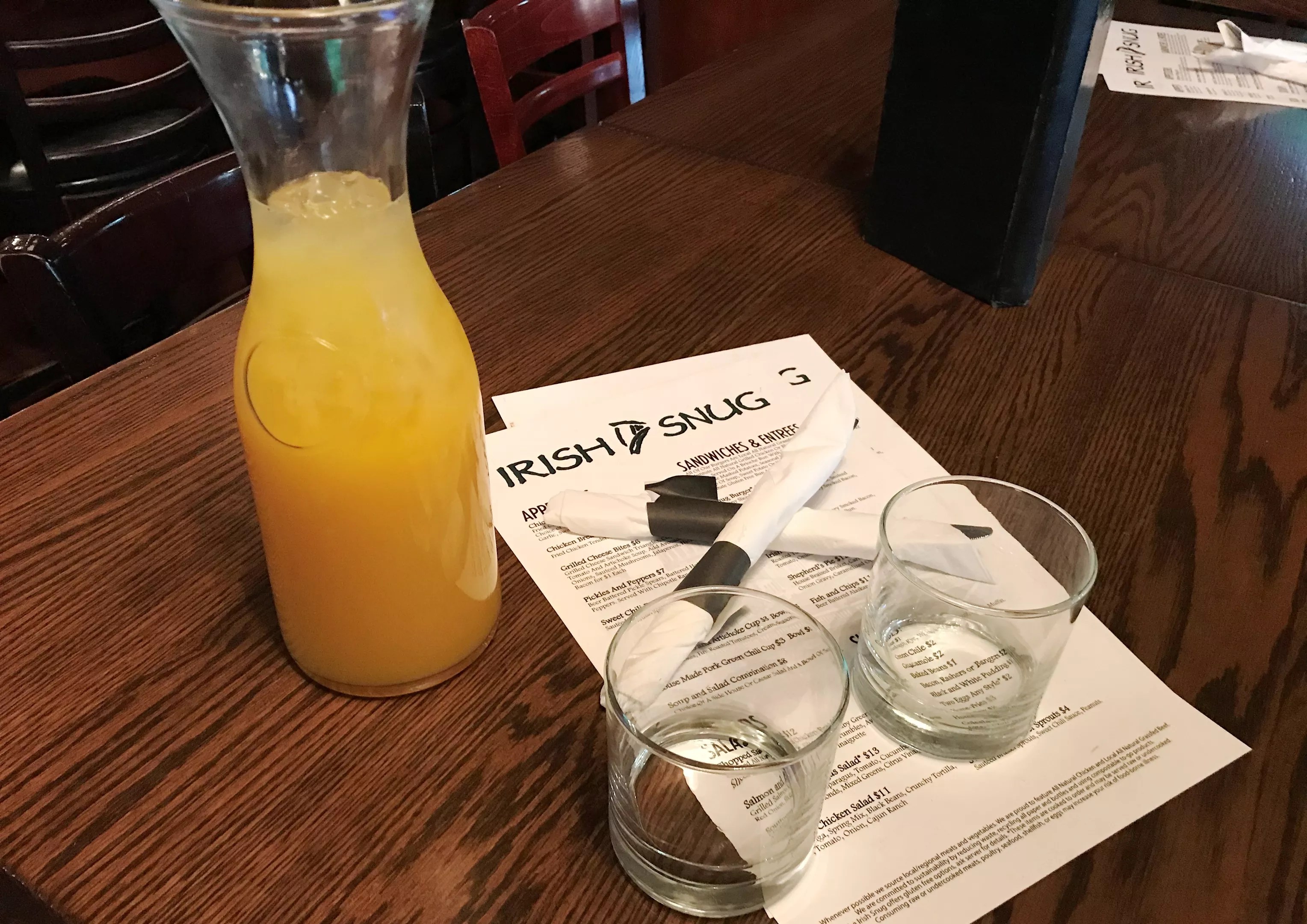 Bottomless mimosas are my go-to drink for brunch, but mimosas were out of the running as soon as I spotted the $10 carafes of screwdrivers – big enough to last through brunch for two people and made with good-quality orange juice. The bar also serves $3 mimosas ($9 for bottomless), a 24-ounce Bloody Mary with a Breckenridge lager chaser for $7, and imported Irish soft drinks.