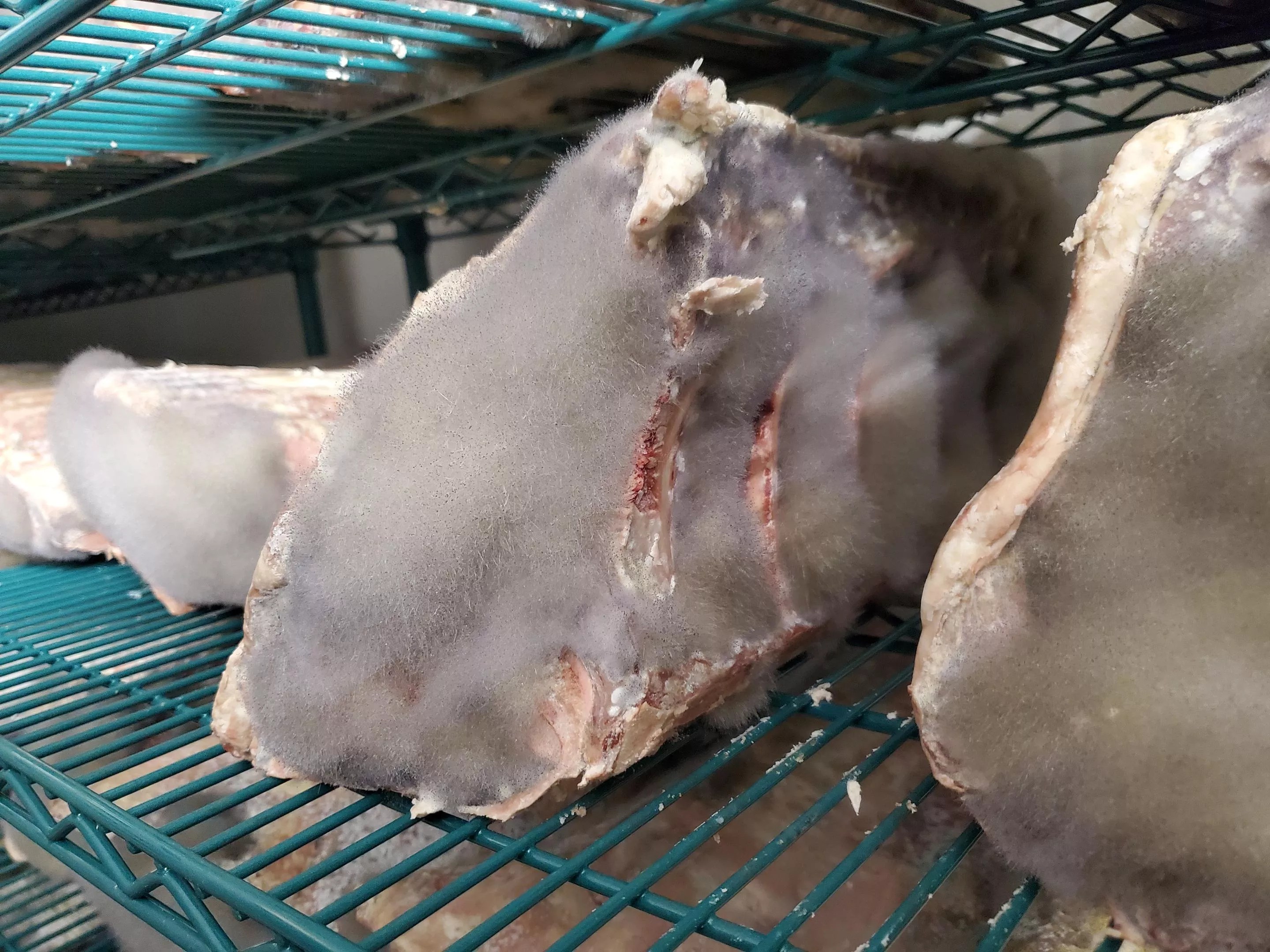The shelves are lined with cuts of beef in varying stages of dry-aging. But unlike most dry-aged beef, this meat is covered with mold – some of it so thick and fuzzy that you can barely tell there’s beef underneath.
