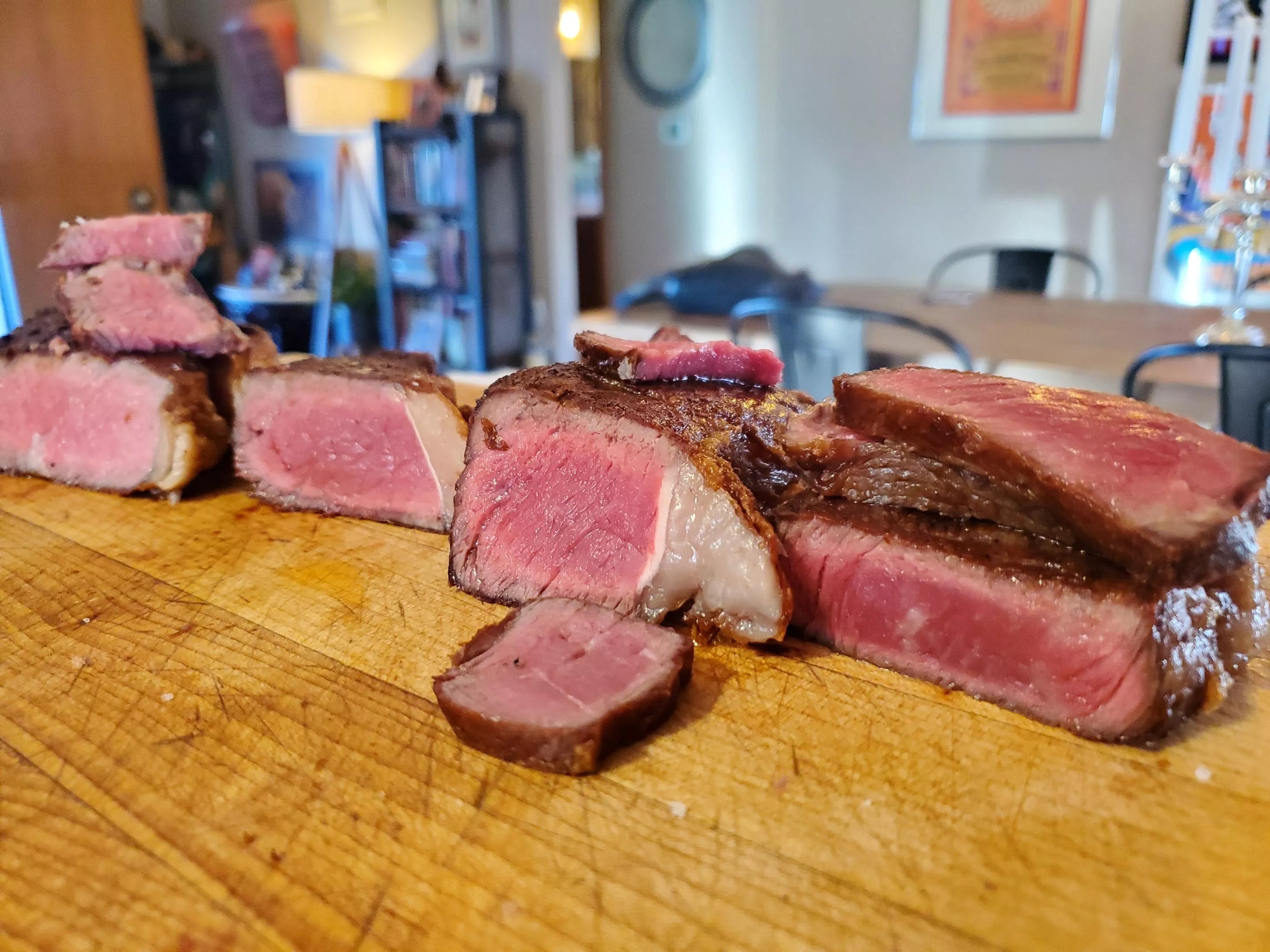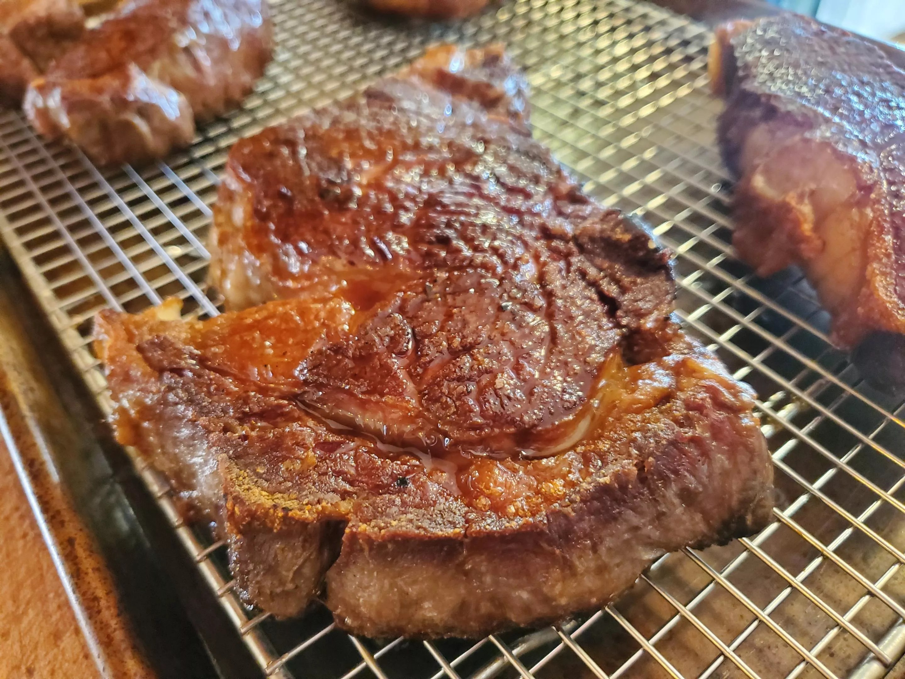 But Brunson has another kind of meat on his mind these days. Back at home, just a few minutes from Meat Cleaver, he heats several cast-iron pans on the stove and begins searing a variety of steaks. The aroma that fills the kitchen is unlike any other – popcorny, like the dry-aging room, with a buttery sweetness.