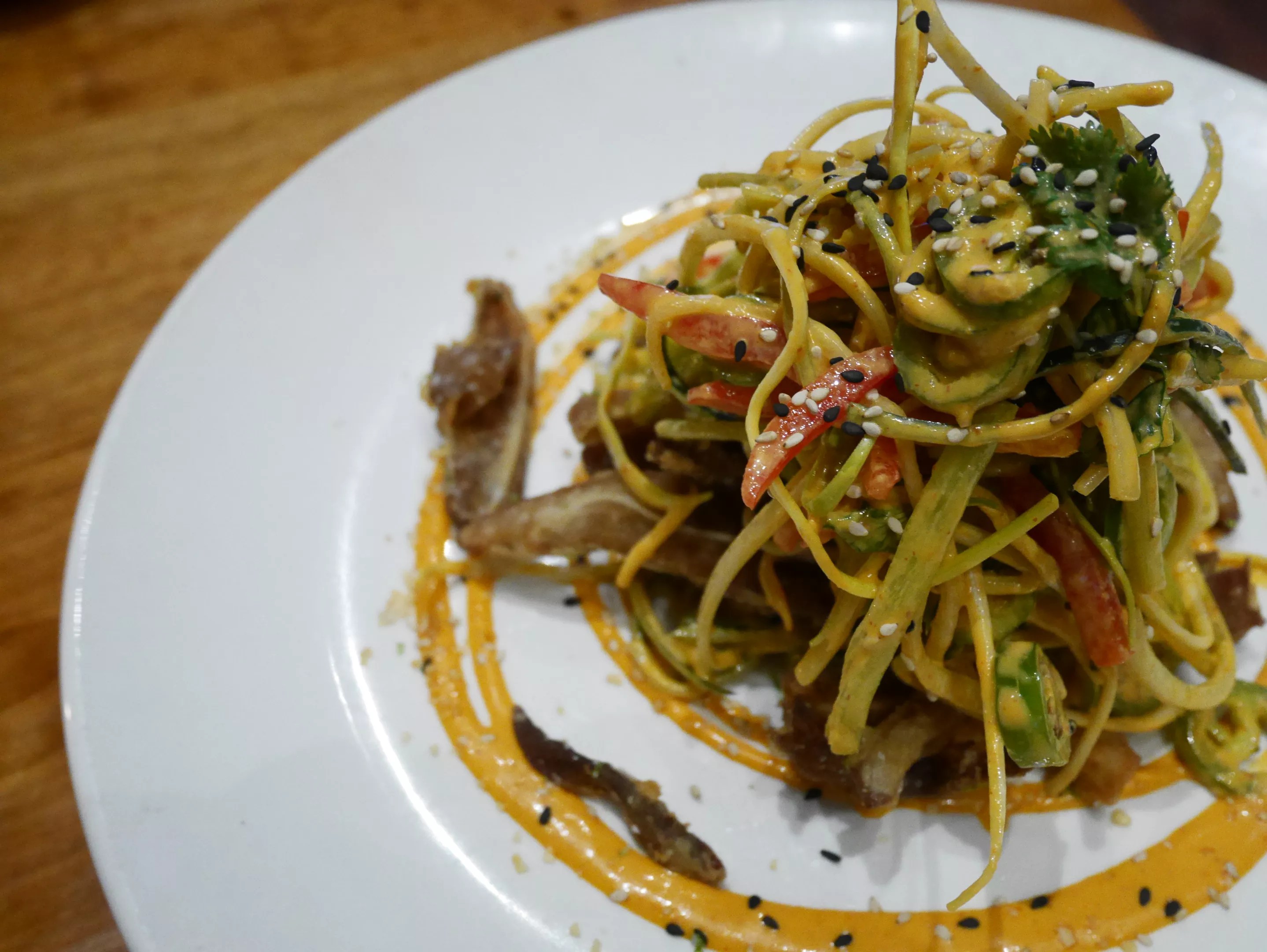 Start your meal with two smaller plates: the crispy rice and crispy pig ears. The rice is exactly as described – crunchy – but the flavor is more robust than you would imagine for a simple rice plate, conveying acidity from lime and brightness from cilantro. The fried pig ears are topped with a salad that balances the fattiness; the salty ears crunch in your mouth and then melt and mingle with the cold sauce and pepper and cucumber strips.