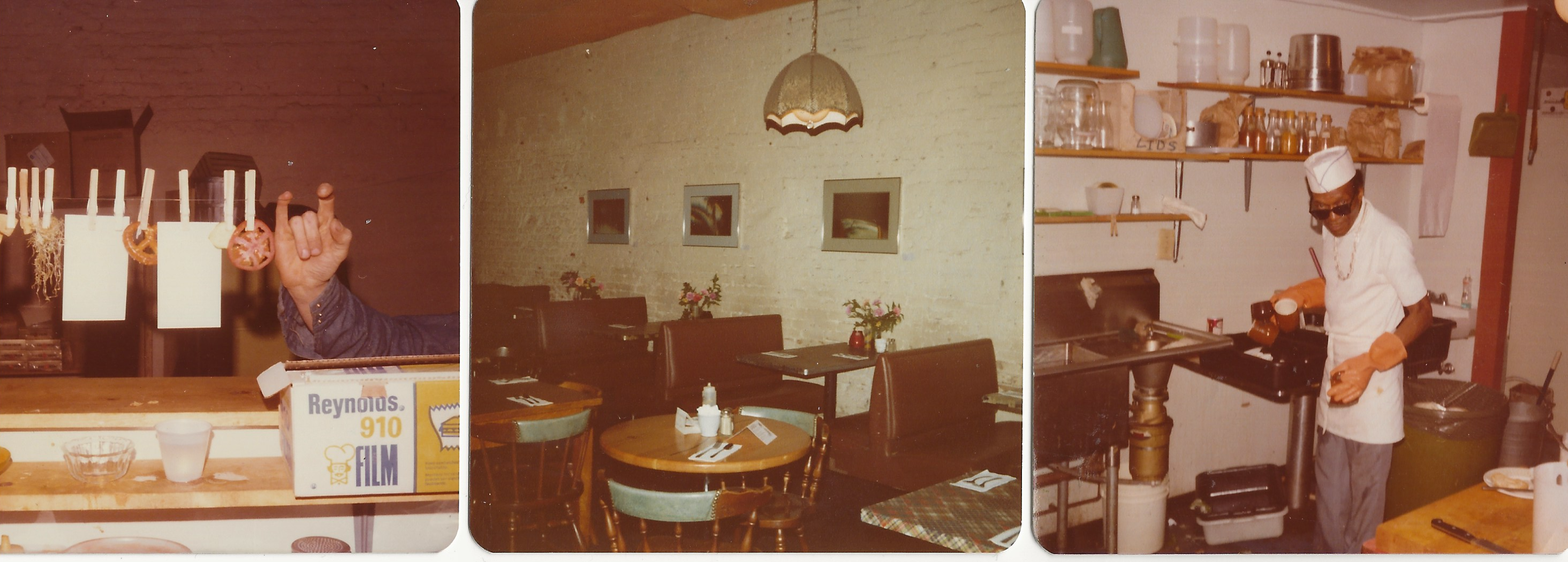 Assorted foods hanging on the ticket line; the cafe’s booths and snakeskin lamps; Jimmy the dishwasher.