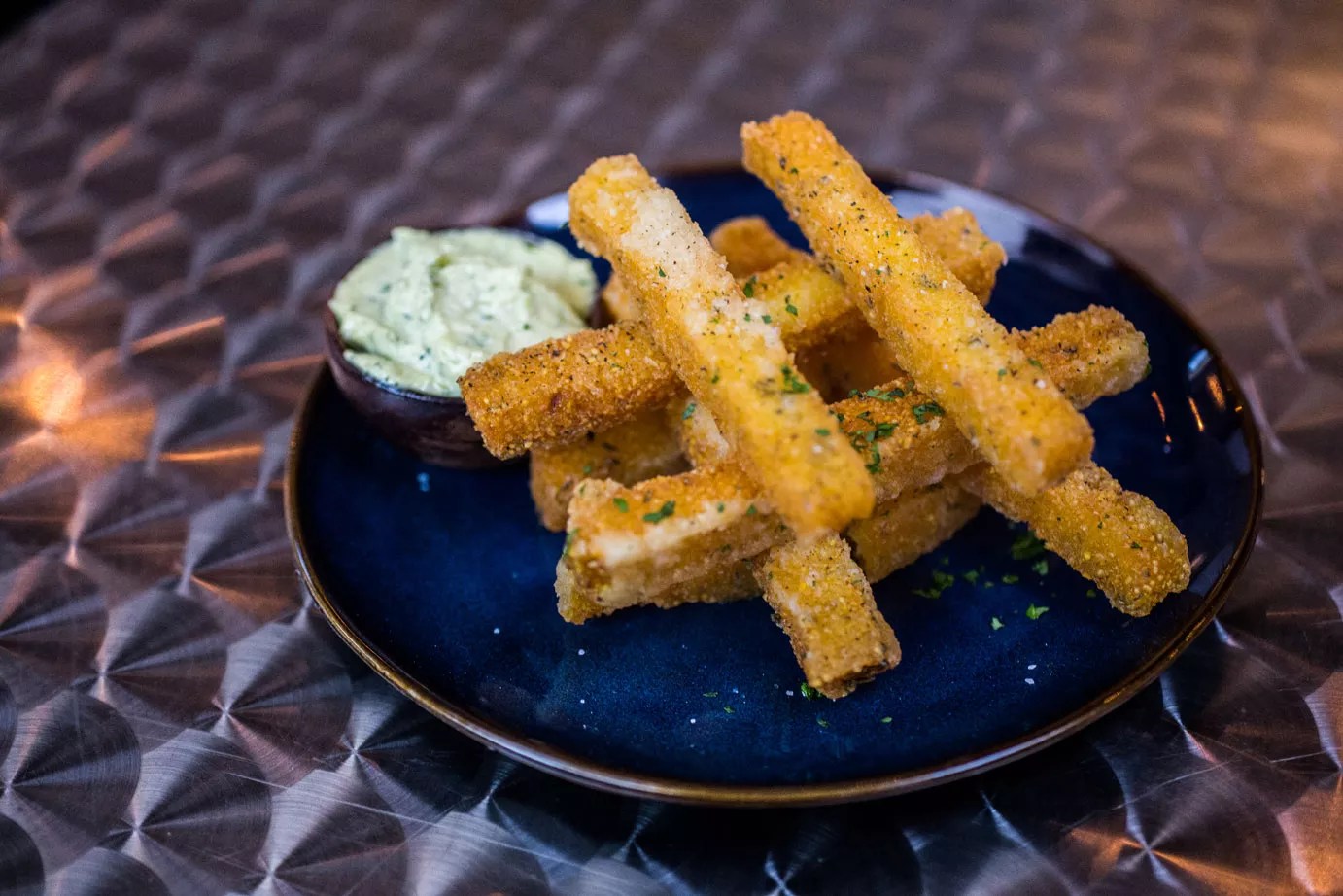 I’ve lived in capital cities where neighborhood haunts were my go-to, with food that was a few notches down from the top but where ambience and convenience made up for it. Clyde could be that place, if only the kitchen worked with more precision. The menu, designed by executive chef Vic Arreola, has a nice flow to it, with wine-friendly small plates, a handful of seasonal, vegetable-based sides, and simple mains with slightly offbeat accents. Hummus made of house-smoked chickpeas is blended with paprika and served with taro chips. Carrots are tinged with brown butter and ginger. Meatballs, offered one night as an add-on to the prix fixe menu, were bathed in sundried-tomato-and-basil butter. Polenta fries, thickly cut and stacked like Lincoln logs, make a smart start when dipped in garlic aioli.