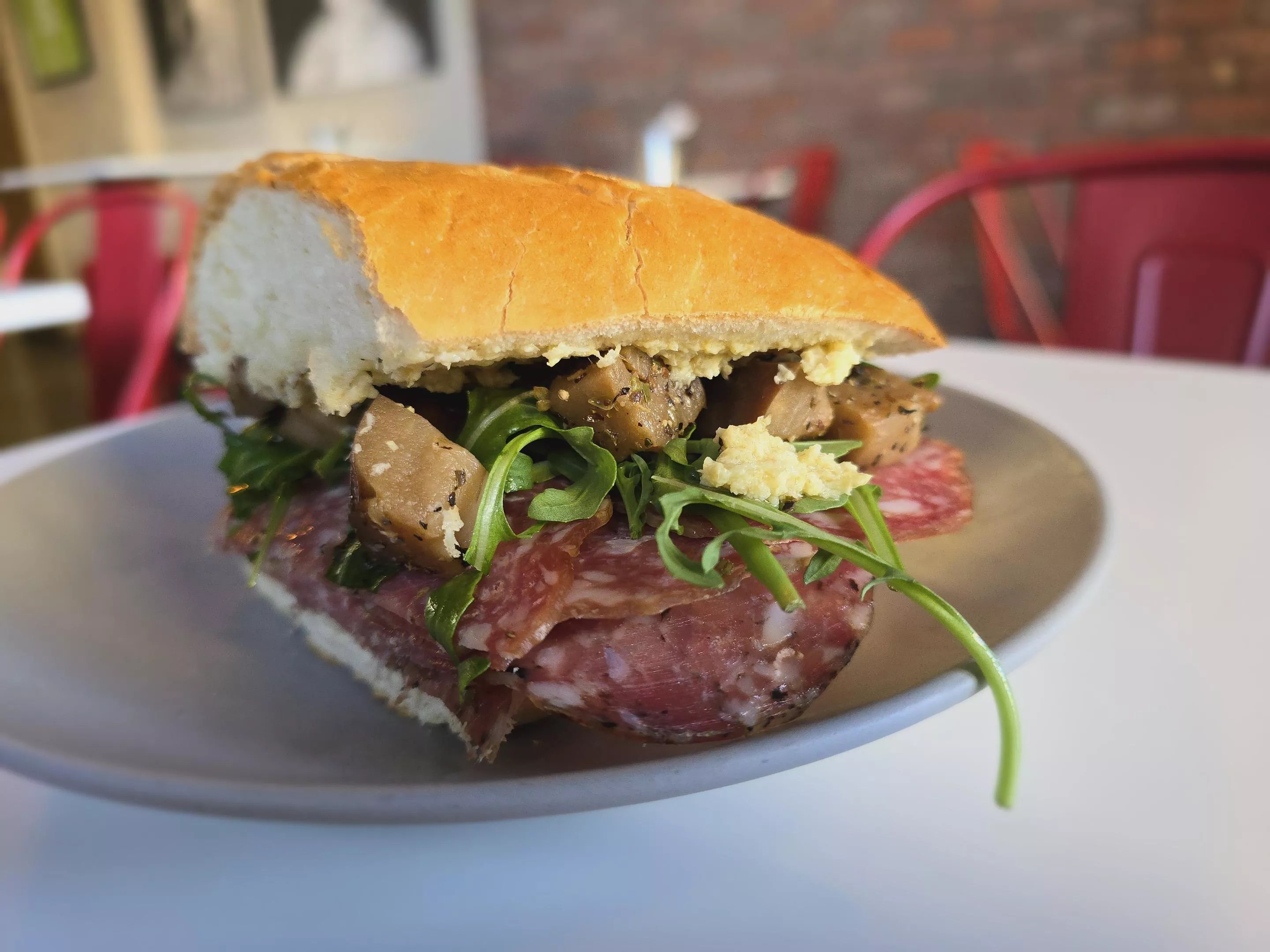 King was inspired by a YouTube video of a popular sandwich in Sicily to create the Sicilian, which is loaded with fennel salami, truffle salami, marinated grilled eggplant, arugula, artichoke spread and a creamy pecorino spread. He’s also doing a riff on an Italian beef made with marinated skirt steak, roasted red peppers, Anaheim chiles, pepperoncini, onion, mozzarella and red sauce.