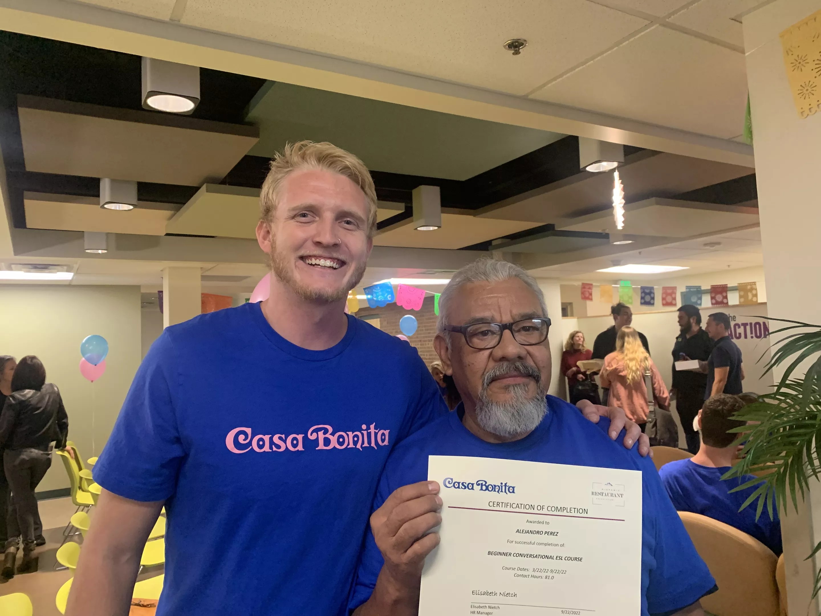 On September 22, those 29 students graduated at a low-key ceremony celebrating their newfound language skills. The room was filled with employees of all ages – from teenagers to folks who could be grandparents – all wearing bright blue T-shirts emblazoned with the restaurant’s name in a familiar pink, curlicued font. As each person was called to the front of the room to collect their certificates, there were cheers from the audience and plenty of warm hugs between teachers and students. An older employee who had completed the Spanish class said to his instructor, “It’s been an honor and a pleasure.”