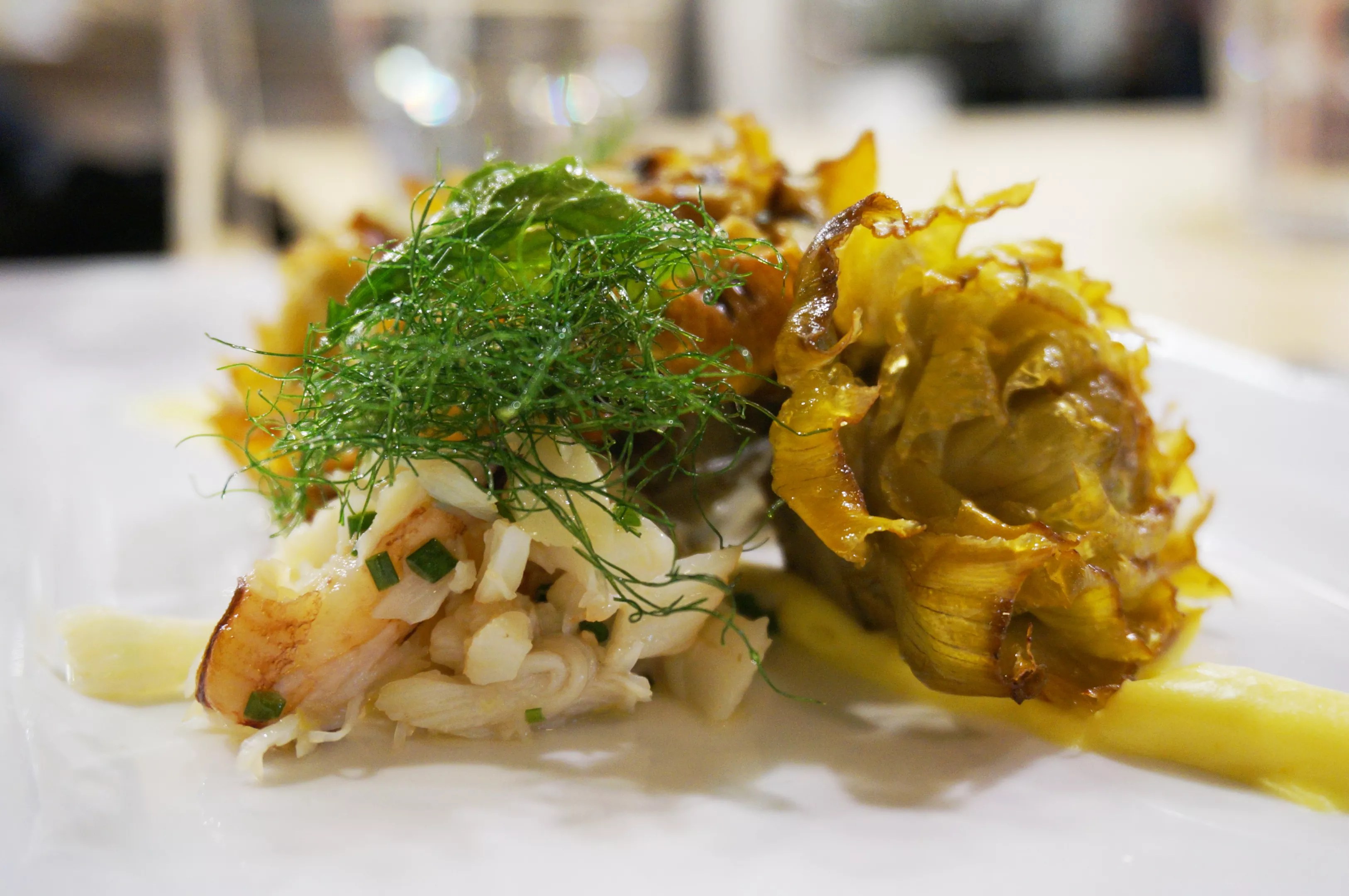 This roasted artichoke with Dungeness crab and fennel fronds shows that the kitchen does more than just meat.